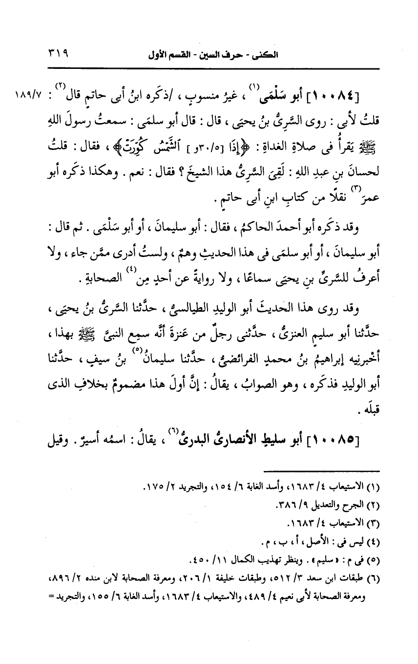 ذَكَرَهُ ابْنُ أَبِي حَاتِمٍ قال قلت: لأبي روى السري بن يحيى قال قال أَبو سلمى سمعت رسول الله صَلى الله عَلَيه وسَلم يقرأ في صلاة الغداة إذا الشمس كورت فقال قلت: لحسان بن عَبد الله لقي السري هذا الشيخ فقال نعم وهكذا ذكره أَبو عمر نقلا من كتاب بن أبي حاتم وقد ذكره أَبو أَحمد الحاكم فقال أَبو سليمان أو أَبو سلمى ثم قال أَبو سليمان أو أَبو سلمى في هذا الحديث وهم ولست أدري ممن جاء ولا أعرف للسرى بن يحيى سماعا ولا رواية، عَن أحد الصحابة.