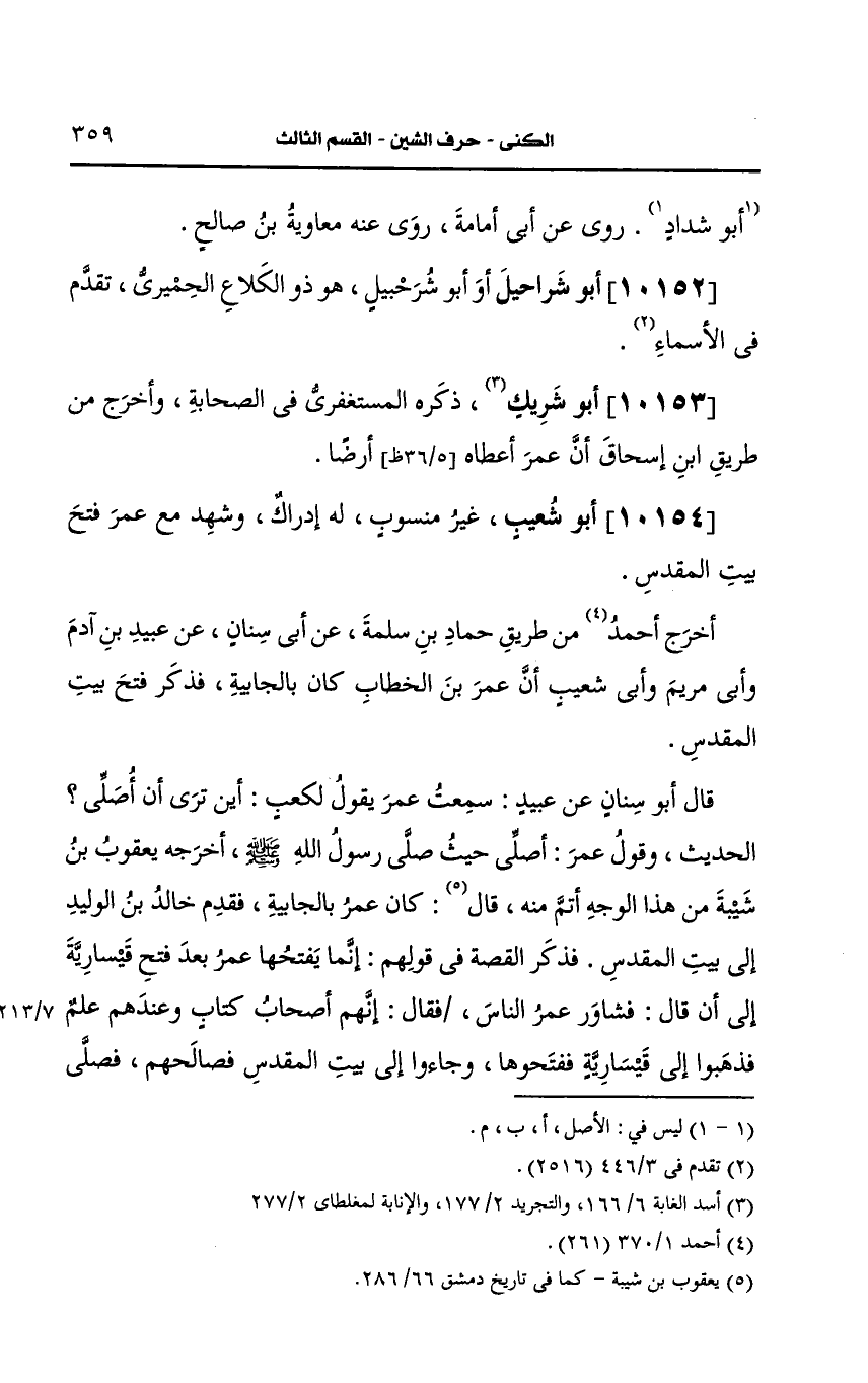 قال أَبو سنان، عَن عبيد سمعت عمر يقول لكعب أين ترى أن أصلي الحديث وقول عمر أصلي ... الحديث صلى رسول الله صَلى الله عَلَيه وسَلم أَخرجه يعقوب بن شيبة من هذا الوجه أتم منه، قال: كان عمر بالجابية فقدم خالد بن الوليد إلى بيت المقدس فذكر القصة في قوله إنما يفتحها عمر بعد فتح قيسارية إلى أن قال فشاور عمر الناس فقال إنهم أصحاب كتاب وعندهم علم فذهبوا إلى قيسارية ففتحوها وجاؤُوا إلى بيت المقدس فصالحهم فصلى عند كنيسة مريم ثم بزق في أحد قميصيه فقيل له ابزق فيها فإنها يشرك فيها بالله فقال إن كان يشرك فيها بالله فإنه يذكر الله فيها كثيرا ثم قال لقد كان عمر غنيا أن يصلي عند وادي جهنم.
