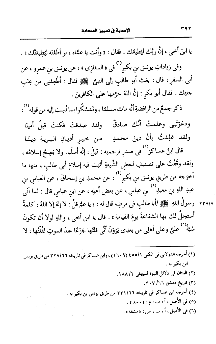 ولقد وقفت على تصنيف لبعض الشيعة أثبت فيه إسلام أبي طالب منها ما أَخرجه من طريق يونس بن بكير، عَن محمد بن إسحاق، عَن العباس بن عَبد الله بن سعيد بن عباس، عَن بعض أهله، عَن ابن عباس قال لما أتى رسول الله صَلى الله عَلَيه وسَلم أبا طالب في مرضه قال له يا عم قل لا إله إلا الله كلمة أستحل بها لك الشفاعة يوم القيامة قال يا بن أخي والله لولا أن تكون سبة علي وعلى أهلي من بعدي يرون أني قلتها جزعا عند الموت لقلتها لا اقولها إلا لأسرك بها فلما ثقل أَبو طالب رؤي يحرك شفتيه فأصغى إليه العباس فسمع قوله فرفع رأسه عنه فقال قد قال والله الكلمة التي سأله عنها.