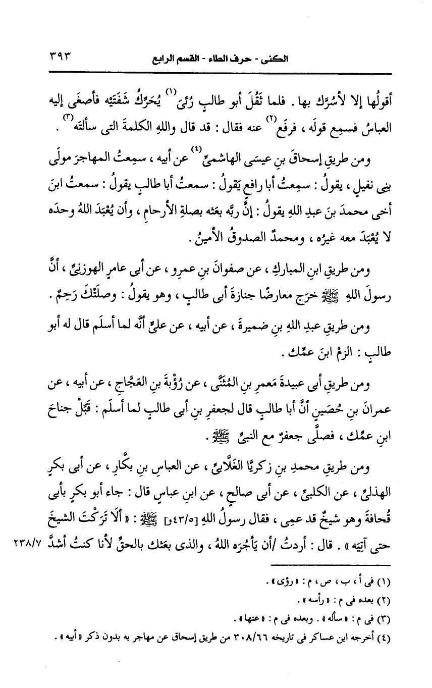 ومن طريق عَبد الله بن ضميرة، عَن أَبيه، عَن علي أنه لما أسلم قال له أَبو طالب الزم بن عمك. ومن طريق أبي عبيدة معمر بن المثنى، عَن رؤبة بن العجاج، عَن أَبيه، عَن عمران بن حصين أن أبا طالب قال لجعفر بن أبي طالب لما أسلم قبل جناح بن عمك فصلى جعفر مع النَّبيّ صَلى الله عَلَيه وسَلم.