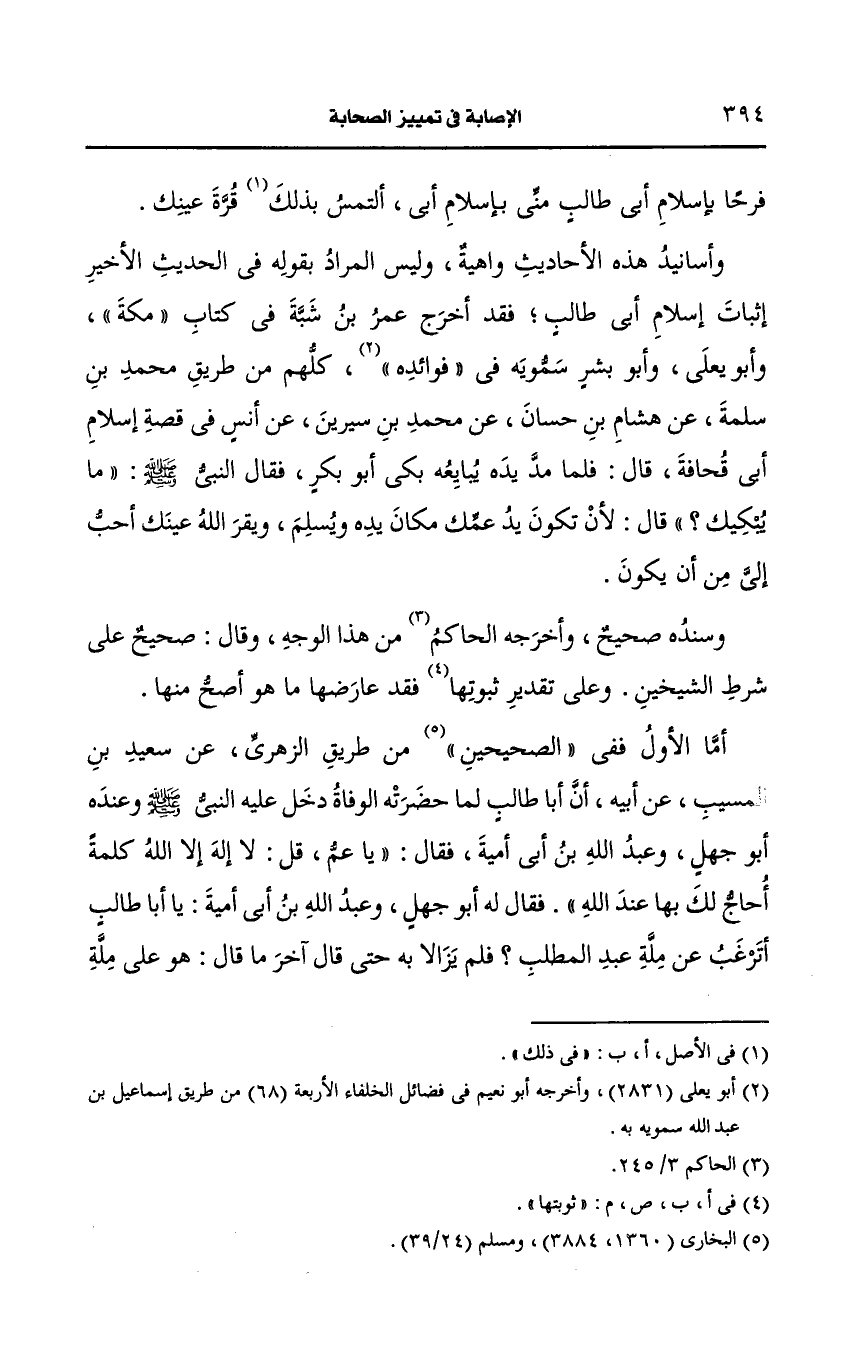 وأسانيد هذه الأحاديث واهية وليس المراد بقوله في الحديث الأخير إثبات إسلام أبي طالب فقد أخرج عمر بن شبة في كتاب مكة، وأَبو يعلى، وأَبو بشر سمويه في فوائده كلهم من طريق محمد بن سلمة، عَن هشام بن حسان، عَن محمد بن سيرين، عَن أنس في قصة إسلام أبي قحافة قال فلما مد يده يبايعه بكى أَبو بكر فقال النَّبيّ صَلى الله عَلَيه وسَلم ما يبكيك قال لأن تكون يد عمك مكان يده ويسلم ويقر الله عينك أحب إلي من أين يكون.