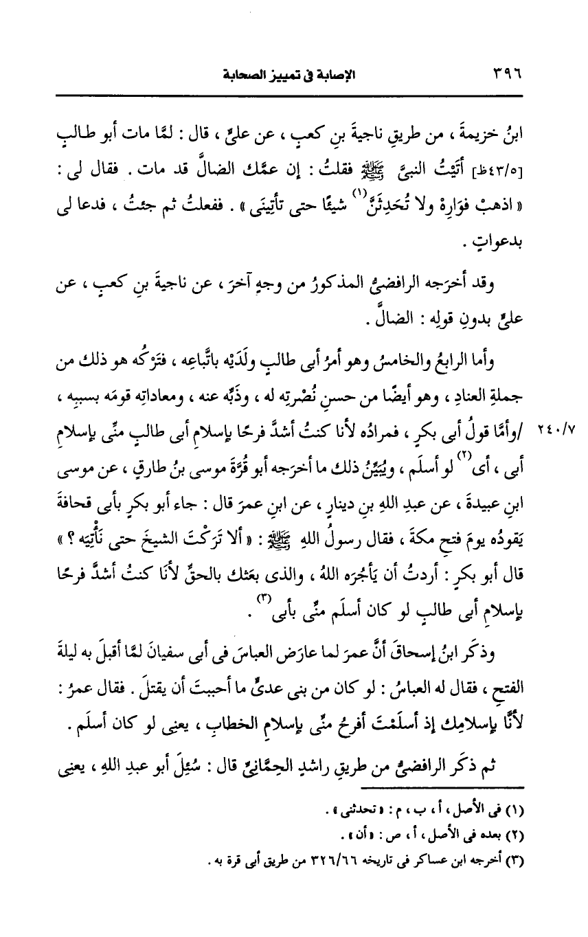 وقد أَخرجه الرافضي المذكور من وجه آخر، عَن ناجية بن كعب، عَن علي بدون قوله الضال. وأما الرابع والخامس وهو أمر أبي طالب ولديه باتبعاه فتركه ذلك هو من جملة العناد وهو أيضًا من حسن نصرته له وذبه عنه ومعاداته قومه بسببه.