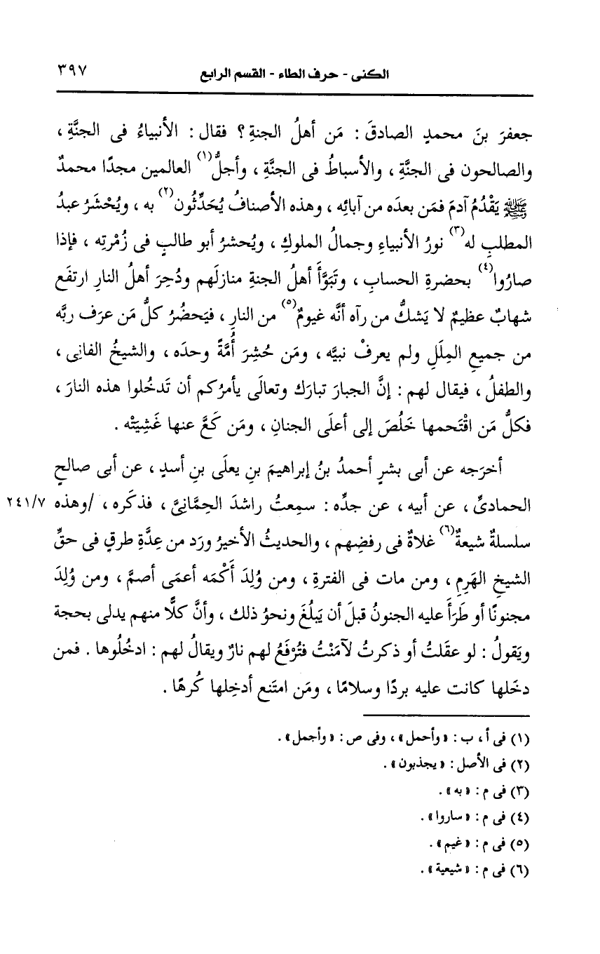ثم ذكر الرافضي من طريق راشد الحماني قال سئل أَبو عَبد الله يعني جعفر بن محمد الصادق من أهل الجنة فقال الأنبياء في الجنة والصالحون في الجنة والأسباط في الجنة وأجل العالمين مجدا محمد صَلى الله عَلَيه وسَلم يقدم آدم فمن بعده من آبائه وهذه الأصناف يحدثون به ويحشر عبد المطلب به نور الأنبياء وجمال الملوك ويحشر أَبو طالب في زمرته فإذا ساروا بحضرة الحساب وتبوأ أهل الجنة منازلهم ودحر أهل النار ارتفع شهاب عظيم لا يشك من رآه أنه غيم من النار فيحضر كل من عرف ربه من جميع الملل ولم يعرف نبيه ومن حشر أمة وحده والشيخ الفاني والطفل فيُقَالُ لَهُ: م إن الجبار تبارك وتعالى يأمركم أن تدخلوا هذه النار فكل من اقتحمها خلص إلى أعلى الجنة ومن كع عنها غشيته.