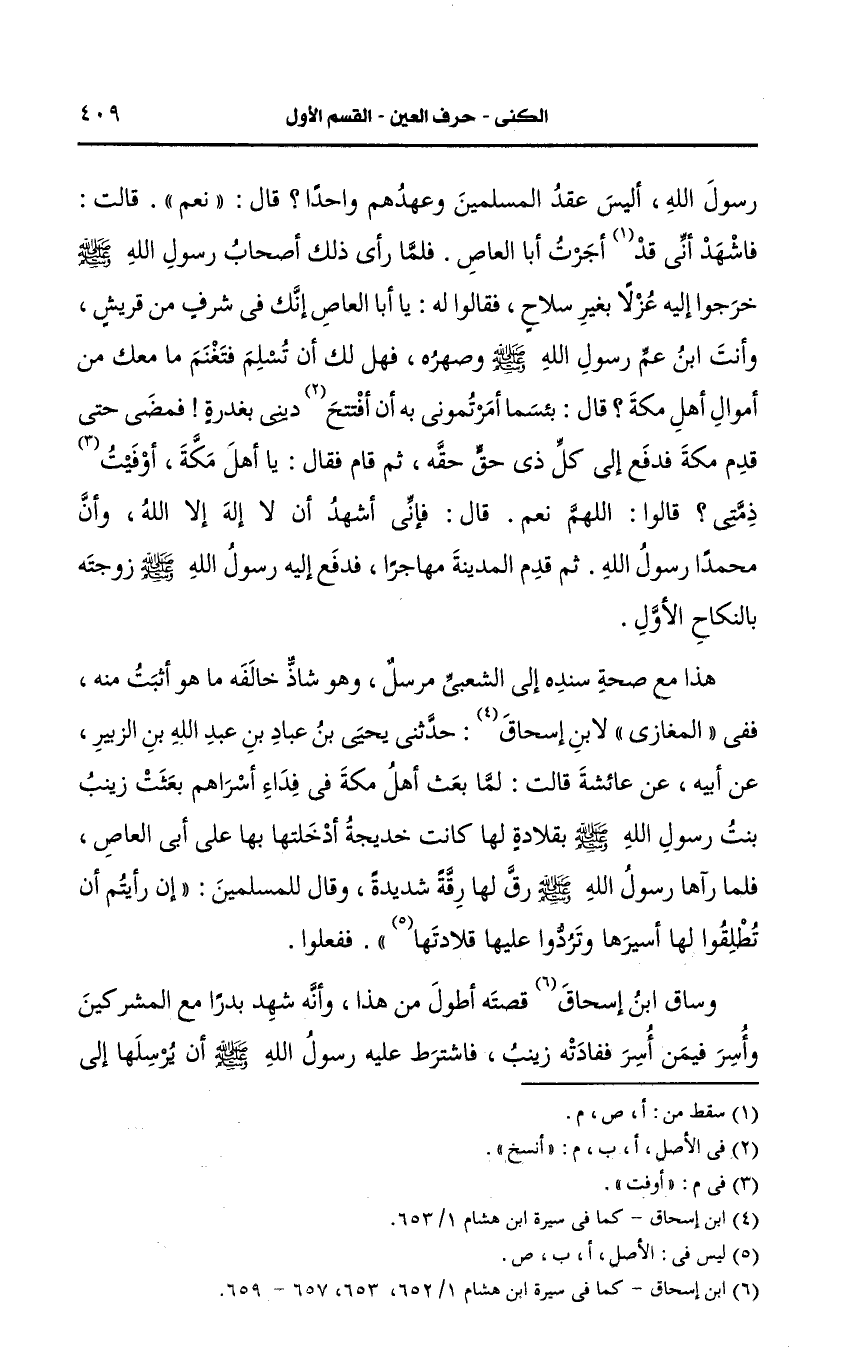 وساق بن إسحاق قصته أطول من هذا وأنه شَهِدَ بَدْرًا مع المشركين وأسر فيمن أسر ففادته زينب فاشترط عليه رسول الله صَلى الله عَلَيه وسَلم أن يرسلها إلى المدينة ففعل ذلك ثم قدم في عير لقريش فأسره المسلمون وأخذوا ما معه فأجارته زينب فرجع الى مكة فأدى الودائع الى أهلها ثم هاجر الى المدينة مسلما فرد النَّبيّ صَلى الله عَلَيه وسَلم اليه ابنته ويمكن الجمع بين الروايتين.