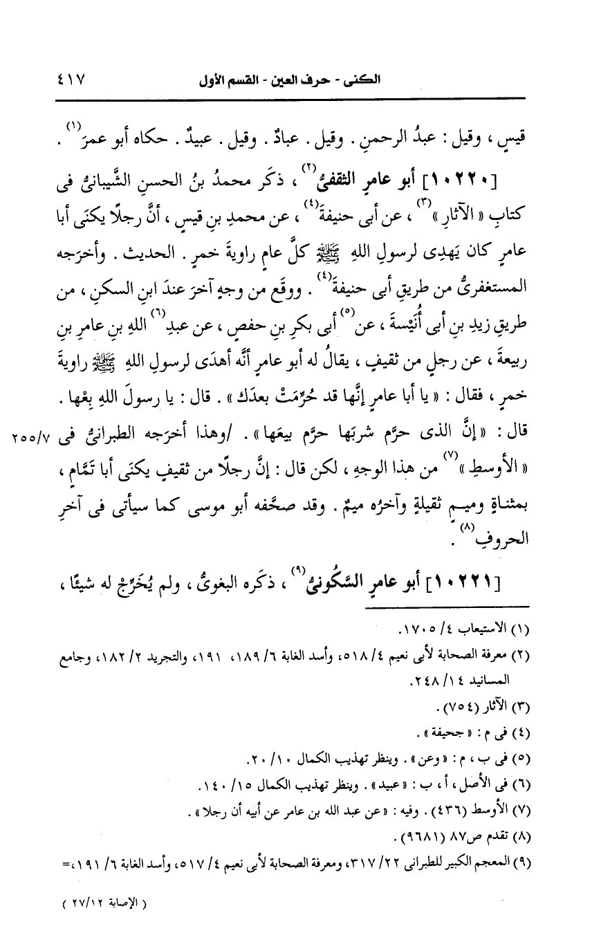 يكنى أبا عامر كان يهدي لرسول الله صَلى الله عَلَيه وسَلم كل عام راوية خمر الحديث أَخرجه المستغفري من طريق أبي جحيفة ووقع من وجه آخر عند بن السَّكَن من طريق زيد بن أبي أنيسة وعن أبي بكر بن حفص، عَن عَبد الله بن عامر بن ربيعة، عَن رجل من ثقيف يُقَالُ لَهُ: أَبو عامر أنه أهدى لرسول الله صَلى الله عَلَيه وسَلم راوية خمر فقال يا أبا عامر إنها قد حرمت بعدك قال يا رسول الله بعها قال إن الذي حرم شربها حرم بيعها".