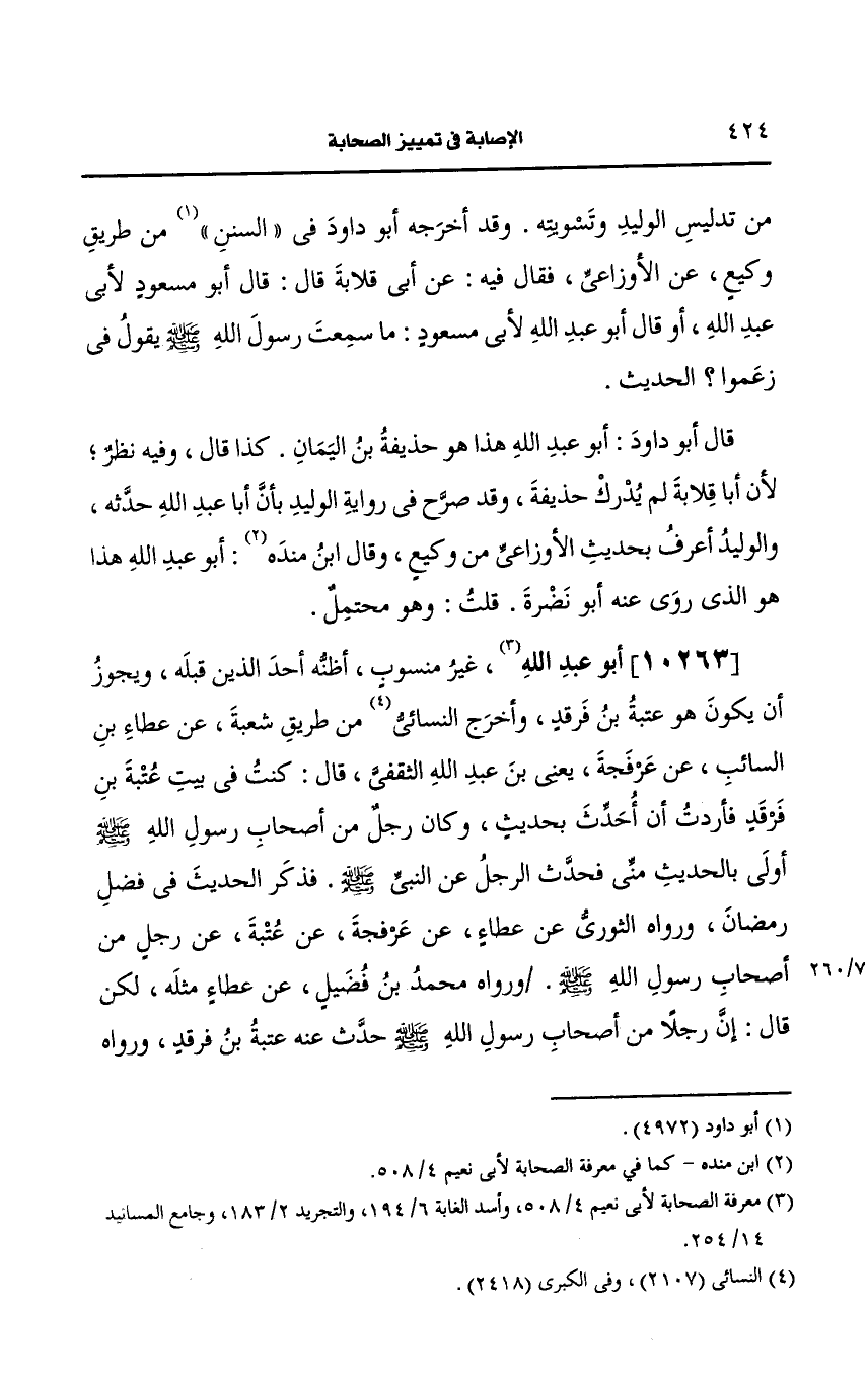 ورواه ابن عُيَيْنَةَ، عَن عطاء، عَن عرفجة، عَن عتبة بن فرقد نفسه قال النسائي حديث شعبة أولى بالصواب من حديث بن عيينة.