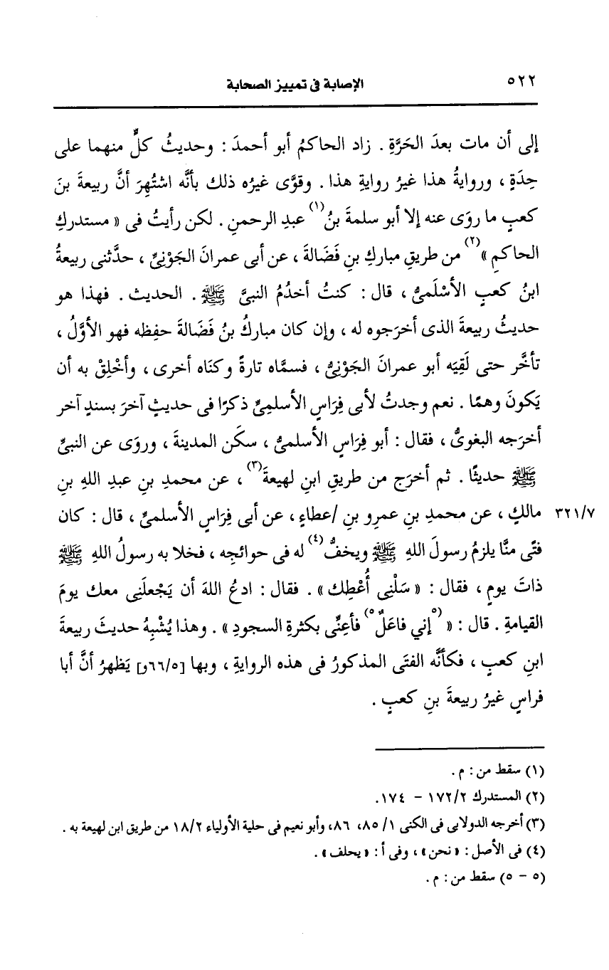 زاد الحاكم أَبو أَحمد وحديث كل منهما على حدة ورواية هذا غير رواية هذا وقوى غيره ذلك بأنه اشتهر أن ربيعة بن كعب ما روى عنه إلا أَبو سلمة عبد الرحمن لكن رأيت في مستدرك الحاكم من طريق مبارك بن فضالة، عَن أبي عمران الجوني حدثني ربيعة بن كعب الأسلمي قال كنت أخدم النَّبيّ صَلى الله عَلَيه وسَلم الحديث فهذا هو حديث ربيعة الذي أخرجوه له وإن كان مبارك بن فضالة حفظه فهو الأول تأخر حتى لقيه أَبو عمران الجوني فسماه تارة وكناه أخرى وأخلق به أن يكون وهما نعم وجدت لأبي فراس الأسلمي ذكرا في حديث آخر بسند أَخرجه البغوي فقال أَبو فراس الأسلمي سكن المدينة وروى عَنِ النَّبِيِّ صَلى الله عَلَيه وسَلم حديثا ثم أخرج من طريق ابن لَهِيعَة، عَن محمد بن عَبد الله بن مالك، عَن محمد بن عَمرو بن عطاء، عَن أبي فراس الأسلمي، قال: كان فتى منا يلزم رسول الله صَلى الله عَلَيه وسَلم ويخف له في حوائجه فخلا به رسول الله صَلى الله عَلَيه وسَلم ذات يوم فقال سلني أعطك فقال ادع الله أن يجعلني معك يوم القيامة قال فأعني بكثرة السجود.