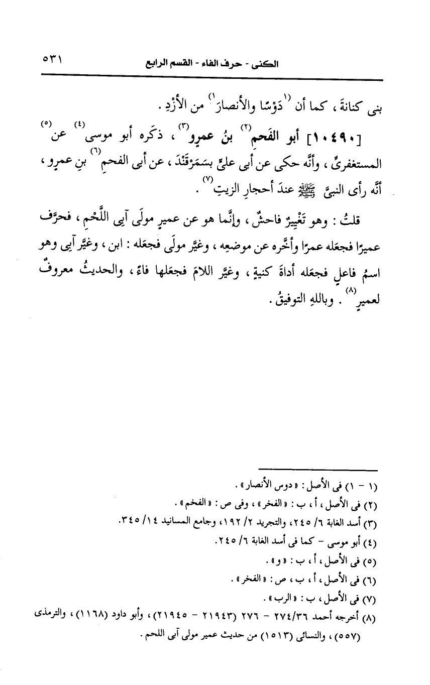 قلت: وهو تغيير فاحش وإنما هو، عَن عمير مولى آبي اللحم فحرف عميرا فجعله عمرا وأخره، عَن موضعه وغير مولى فجعله ابنا وغير آبي وهو اسم فاعل فجعله أداة كنية وغير اللام فجعلها فاء والحديث معروف لعمير وبالله التوفيق.