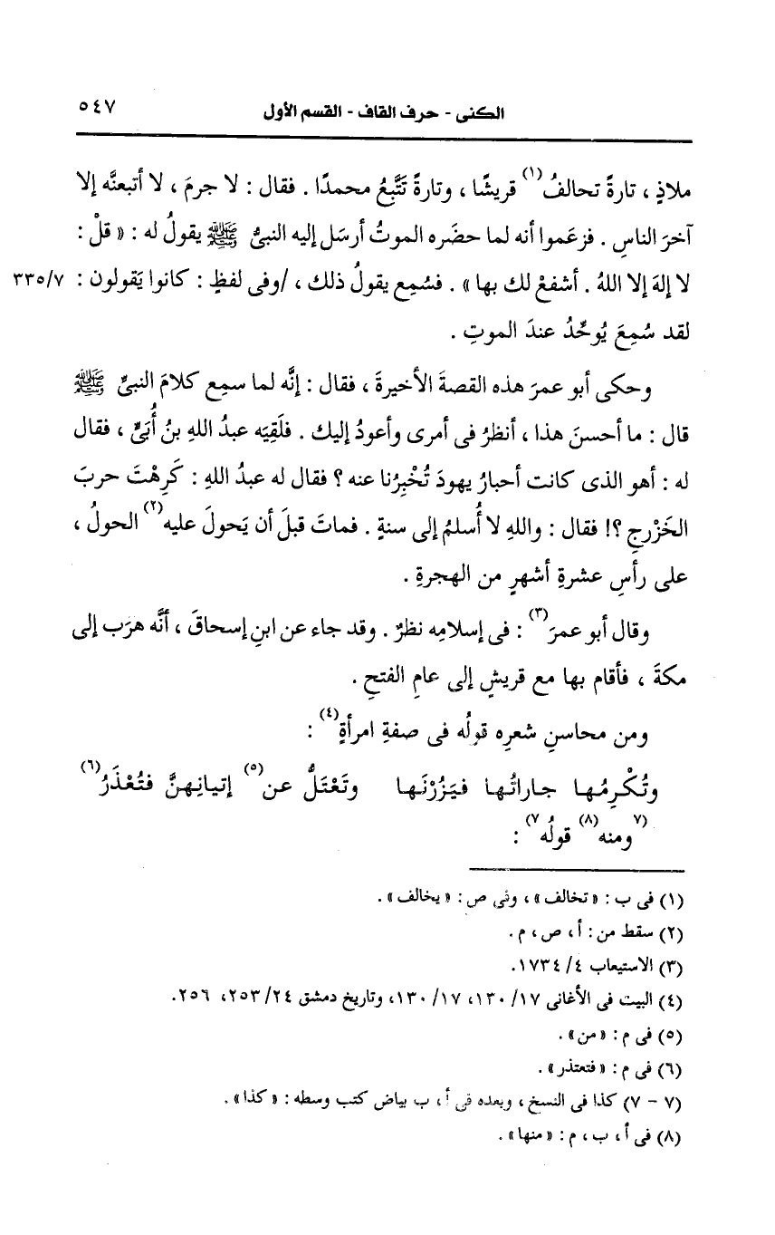 وحكى أَبو عمر هذه القصة الأخيرة فقال إنه لما سمع كلام النَّبيّ صَلى الله عَلَيه وسَلم قال ما أحسن هذا أنظر في أمري وأعود إليك فلقيه عَبد الله بن أبي فقال له أهو الذي كانت أحبار يهود تخبرنا عنه فقال له عَبد الله كرهت حرب الخزرج فقال والله لا أسلم إلى سنة فمات قبل أن يحول الحول على رأس عشرة أشهر من الهجرة وقال أَبو عُمَر في إسلامه نظر وقد جاء، عَن ابن إسحاق أنه هرب إلى مكة فأقام بها مع قريش إلى عام الفتح.
