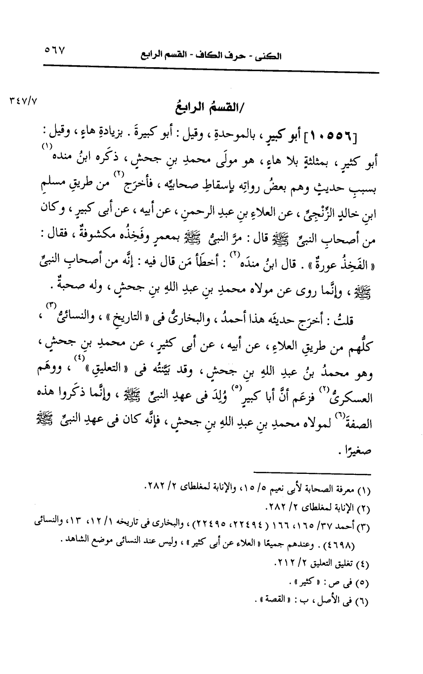 قلت: أخرج حديثه هذا أَحمد والبُخارِيّ في التاريخ والنسائي كلهم من طريق العلاء، عَن أَبيه، عَن أبي كثير، عَن محمد بن جحش وهو محمد بن عَبد الله بن جحش وقد بينته في التعليق.