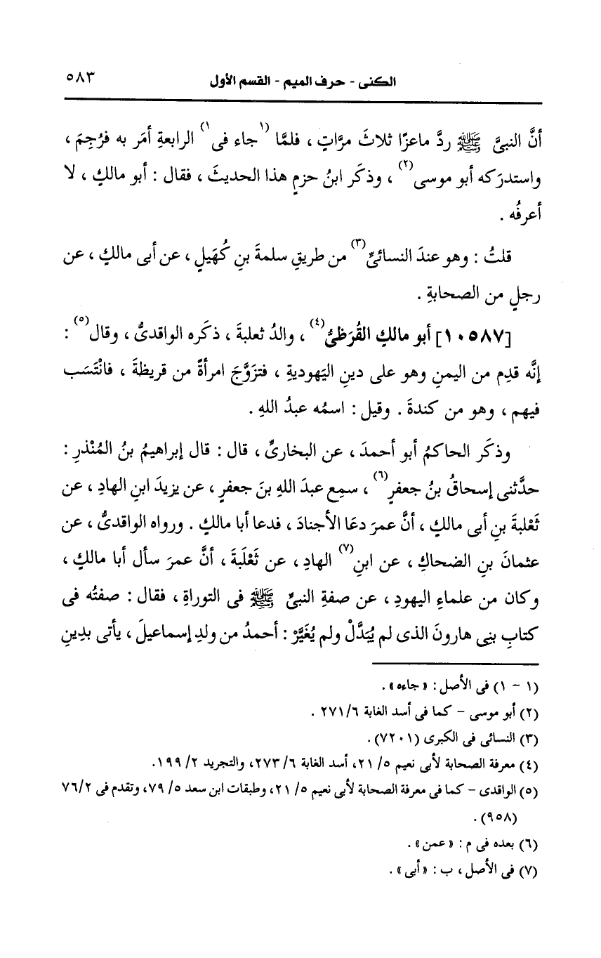 ورواه الواقدي، عَن عثمان بن الضحاك، عَن ابن الهاد، عَن ثعلبة أن عمر سأل أبا مالك، وكان من علماء اليهود، عَن صفة النَّبيّ صَلى الله عَلَيه وسَلم في التوراة فقال صفته في كتاب بني هارون الذي لم يبدل ولم يغير أَحمد من ولد إسماعيل يأتي بدين الحنيفية دين إبراهيم يأتزر على وسطه ويغسل أطرافه وهو آخر الأنبياء فذكر الحديث بطوله.