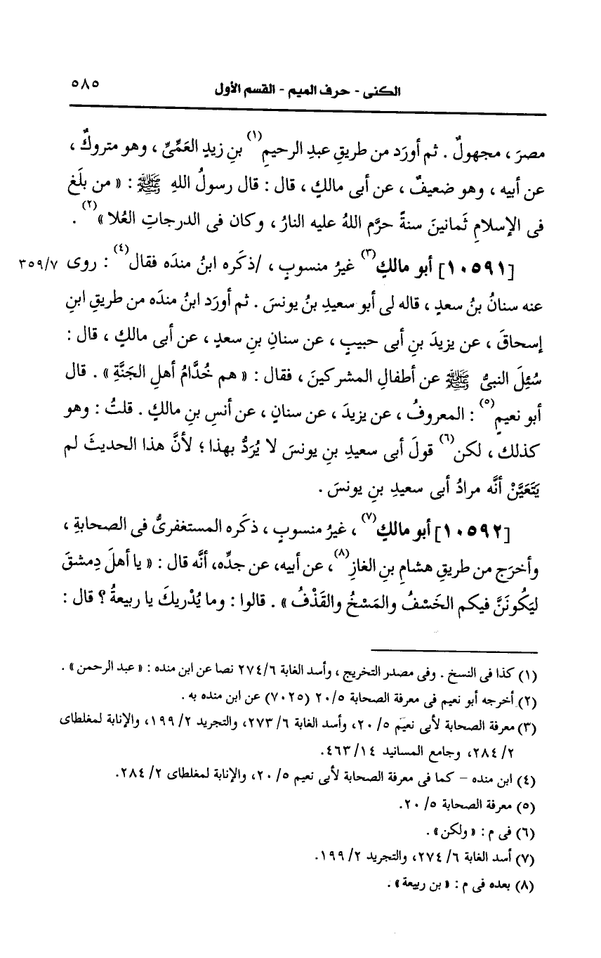 أورد ابن مَنْدَه من طريق ابن إِسحَاق، عَن يزيد بن أبي حبيب، عَن سنان ابن سَعد، عَن أبي مالك قال سئل النَّبيّ صَلى الله عَلَيه وسَلم، عَن أطفال المشركين فقال هم خدام أهل الجنة.