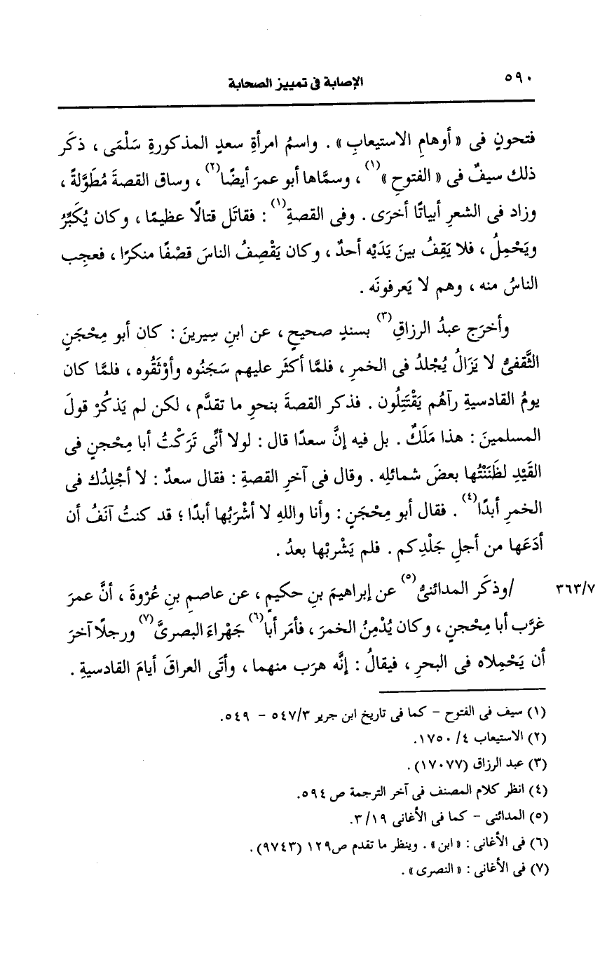 وأخرج عبد الرزاق بسند صحيح، عَن ابن سيرين كان أَبو محجن الثَّقفي لا يزال يجلد في الخمر فلما أكثر عليهم سجنوه وأوثقوه فلما كان يوم القادسية رآهم يقتتلون فذكر القصة بنحو ما تقدم لكن لم يذكر قول المسلمين هذا ملك بل فيه إن سعدا قال لولا أني تركت أبا محجن في القيد لظننتها بعض شمائله وقال في آخر القصة فقال لا أجلدك في الخمر أبدا فقال أَبو محجن وأنا والله لا أشربها أبدا قد كنت آنف أن أدعها من أجل جلدكم فلم يشربها بعد.