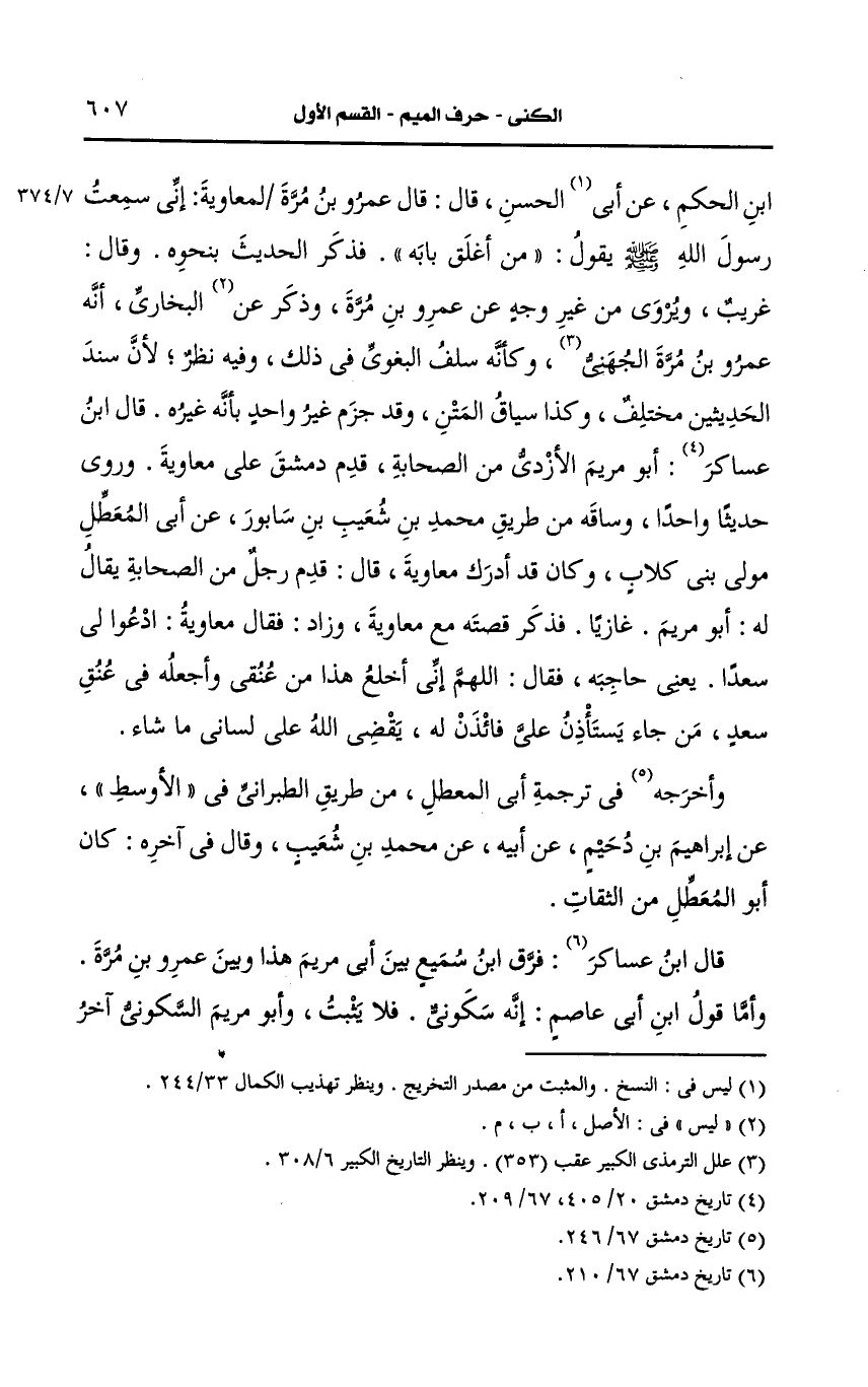 وقال غريب ويروي من غير وجه، عَن عَمرو بن مرة وذكر البُخارِيّ أنه عَمرو بن مرة الجهني وكأنه سلف البغوي في ذلك وفيه نظر فإن سند الحديثين مختلف وكذا سياق المتن.