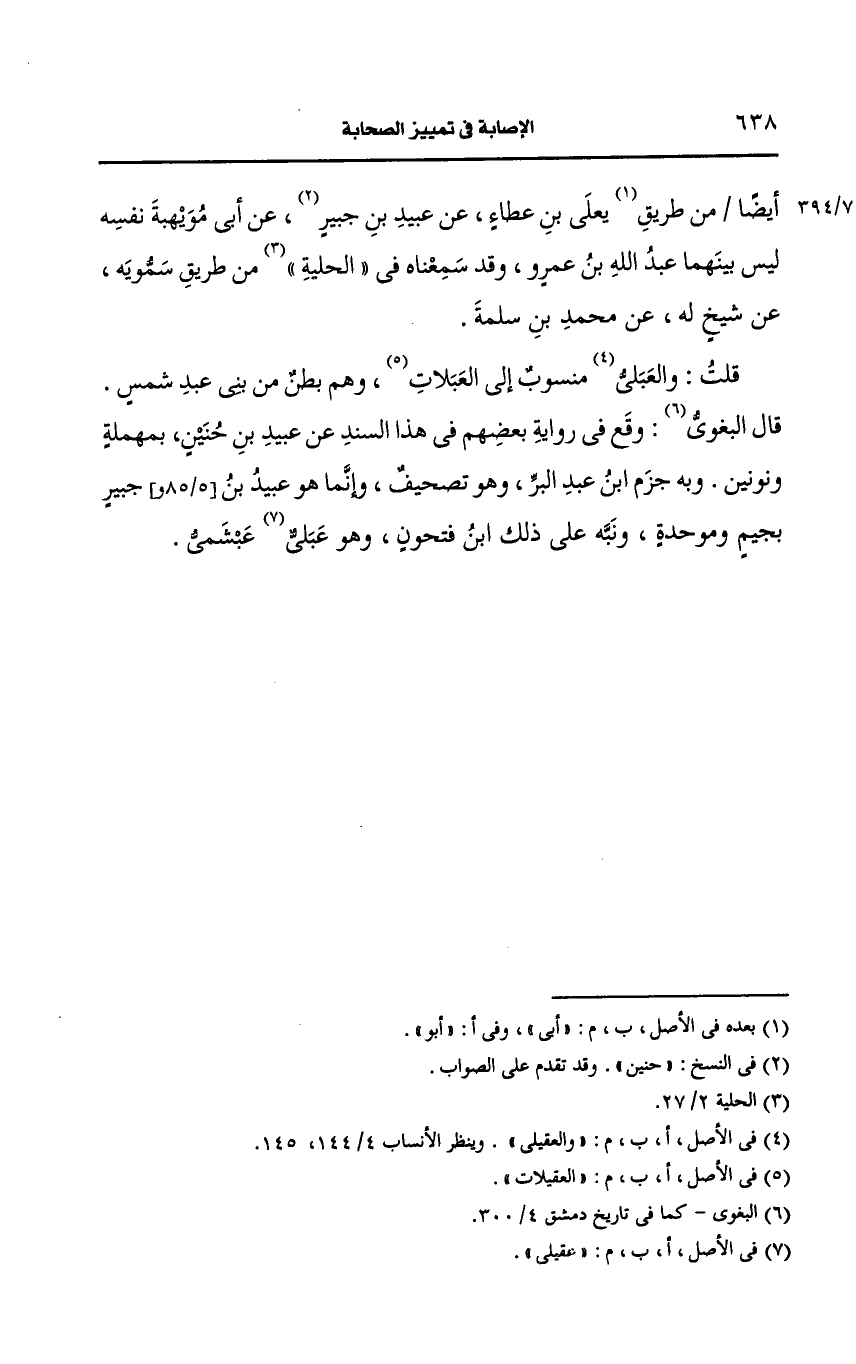 قال البَغَوِيُّ: وقع في رواية بعضهم في هذا السند، عَن عبيد بن حنين بمهملة ونونين وبه جزم ابن عَبد البَرِّ وهو تصحيف وإنما هو عبيد بن جبير بجيم وموحدة ونبه على ذلك ابن فتحون وهو عقيلي عبشمي.