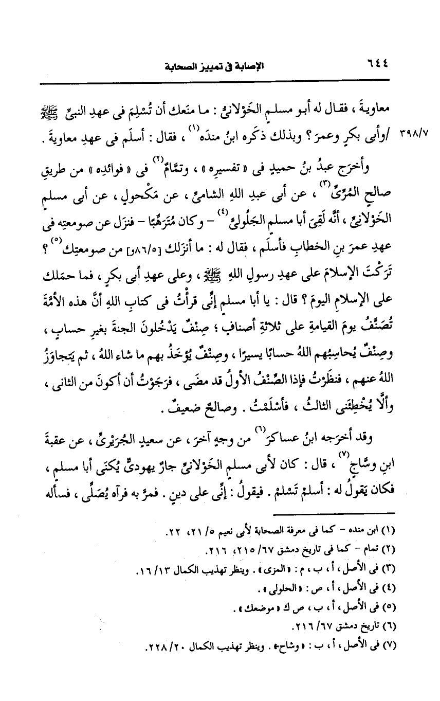 وأخرج عبد بن حميد في تفسيره وتمام في فوائده من طريق صالح المزي، عَن أبي عَبد الله الشامي، عَن مكحول، عَن أبي مسلم الخولاني أنه لقي أبا مسلم الجلولي، وكان مترهبا فنزل، عَن صومعته في عهد عمر بن الخطاب فأسلم فقال له ما أنزلك من صومعتك تركت الإسلام على عهد رسول الله صَلى الله عَلَيه وسَلم وعلى عهد أبي بكر فما حملك على الإسلام اليوم قال يا أبا مسلم إني قرأت في كتاب الله أن هذه الأمة تصنف يوم القيامة على ثلاثة أصناف صنف يدخلون الجنة بغير حساب وصنف يحاسبهم الله حسابا يسيرا وصنف يؤخذ بهم ما شاء الله ثم يتجاوز الله عنهم فنظرت فإذا الصنف الأول قد مضى فرجوت أن أكون من الثاني وألا يخطئني الثالث فأسلمت وصالح ضعيف.