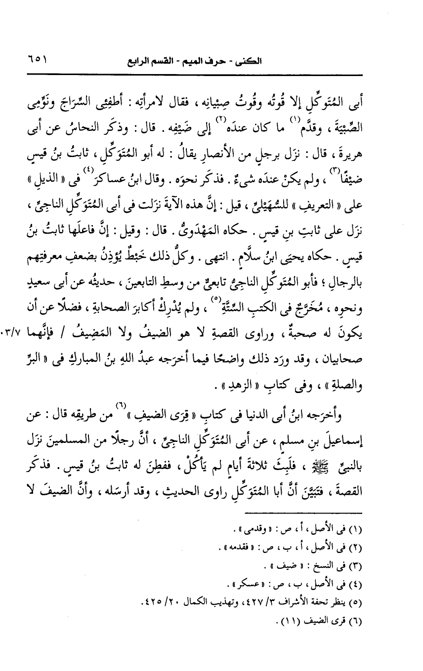 وكل ذلك خبط يؤذن بضعف معرفتهم بالرجال فأبو المتوكل الناجي تابعي من وسط التابعين حديثه، عَن أبي سعيد ونحوه مخرج في الكتب الستة ولم يدرك أكابر الصحابة فضلا، عَن أن يكون له صُحبَةٌ وراوي القصة لا هو الضيف ولا المضيف فإنهما صحابيان وقد ورد ذلك واضحا فيما أَخرجه عَبد الله بن المبارك في البر والصلة وفي كتاب الزهد.