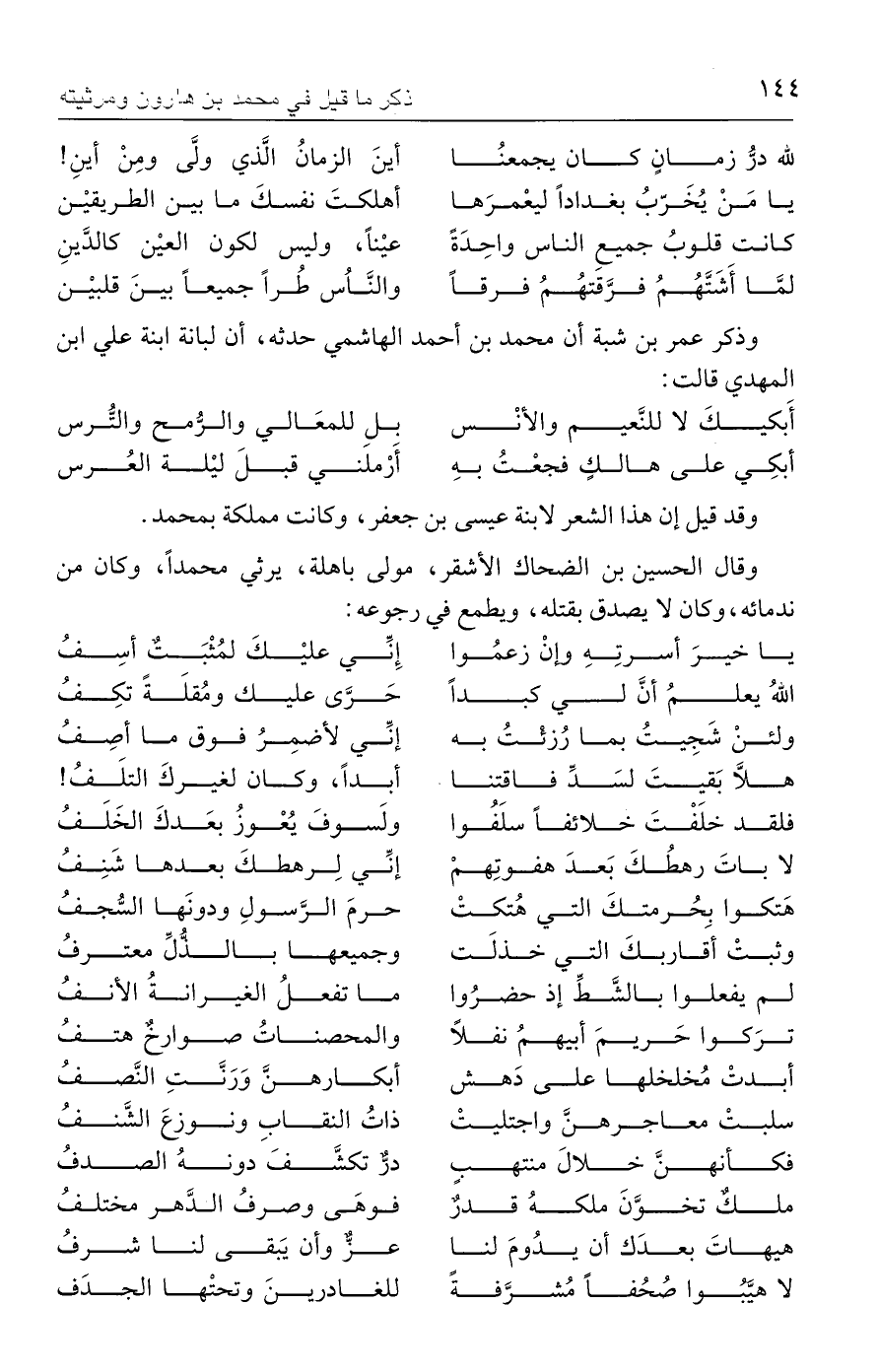 وقال الحسين بن الضحاك الأشقر، مولى باهلة، يرثي محمدًا، وكان من ندمائه، وكان لا يصدق بقتله، ويطمع في رجوعه: