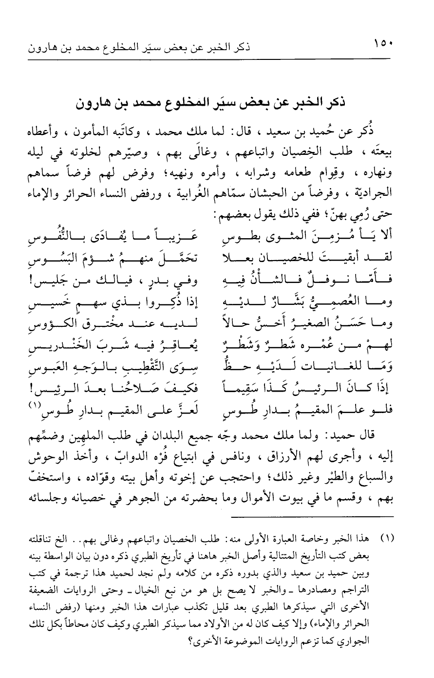 (١) هذا الخبر وخاصة العبارة الأولى منه: طلب الخصيان واتباعهم وغالى بهم .. الخ تناقلته بعض كتب التأريخ المتتالية وأصل الخبر هاهنا في تأريخ الطبري ذكره دون بيان الواسطة بينه وبين حميد بن سعيد والذي بدوره ذكره من كلامه ولم نجد لحميد هذا ترجمة في كتب التراجم ومصادرها - والخبر لا يصح بل هو من نبع الخيال - وحتى الروايات الضعيفة الأخرى التي سيذكرها الطبري بعد قليل تكذب عبارات هذا الخبر ومنها (رفض النساء الحرائر والإماء) وإلا كيف كان له من الأولاد مما سيذكر الطبري وكيف كان محاطًا بكل تلك الجواري كما تزعم الروايات الموضوعة الأخرى؟