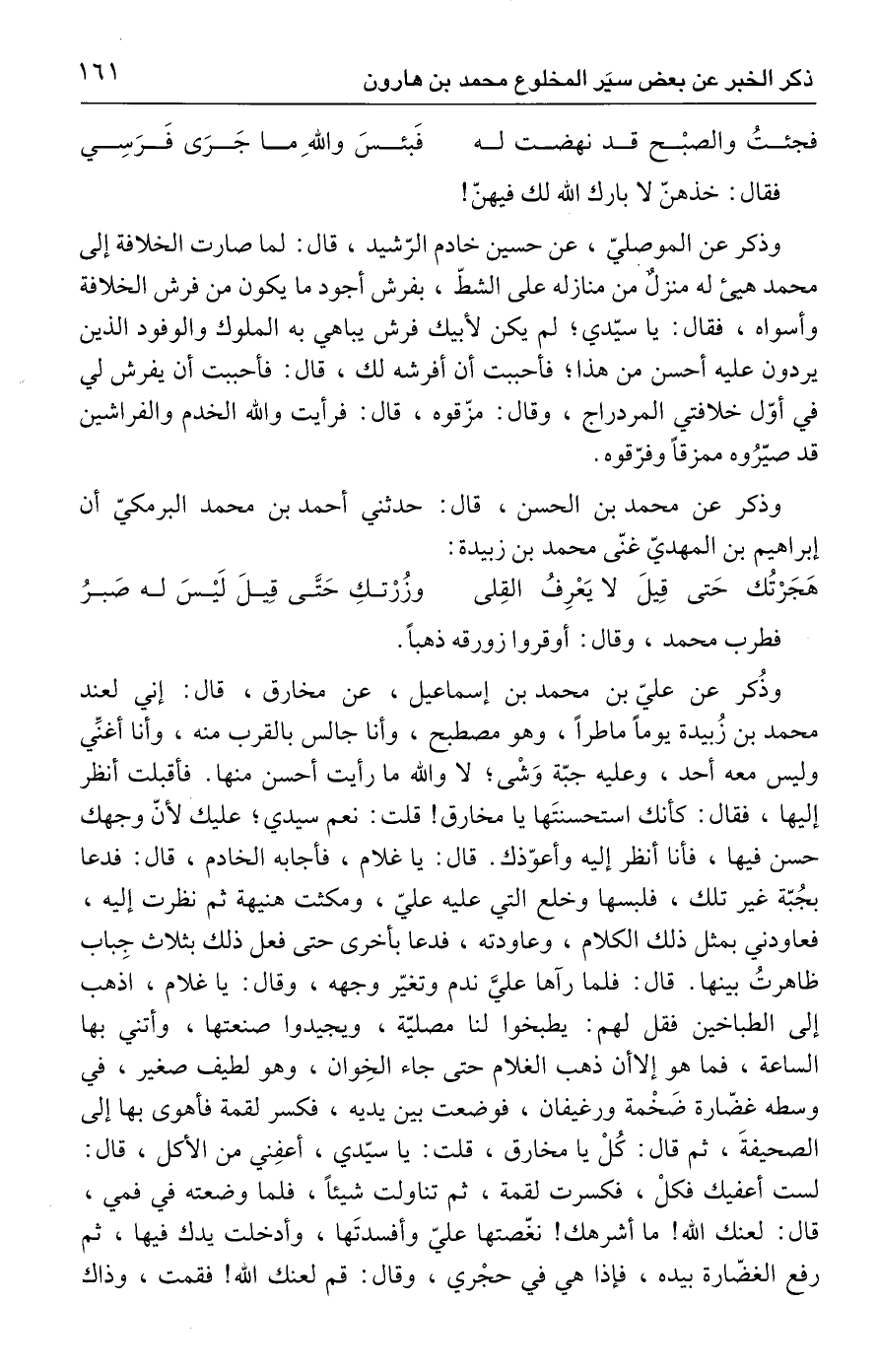 وذُكر عن عليّ بن محمد بن إسماعيل، عن مخارق، قال: إني لعند محمد بن زُبيدة يومًا ماطرًا، وهو مصطبح، وأنا جالس بالقرب منه، وأنا أغنِّي وليس معه أحد، وعليه جبّة وَشْى، لا والله ما رأيت أحسن منها. فأقبلت أنظر إليها، فقال: كأنك استحسنتَها يا مخارق! قلت: نعم سيدي؛ عليك لأنّ وجهك حسن فيها، فأنا أنظر إليه وأعوّذك. قال: يا غلام، فأجابه الخادم، قال: فدعا بجُبّة غير تلك، فلبسها وخلع التي عليه عليّ، ومكثت هنيهة ثم نظرت إليه، فعاودني بمثل ذلك الكلام، وعاودته، فدعا بأخرى حتى فعل ذلك بثلاث جِباب ظاهرتُ بينها. قال: فلما رآها عليَّ ندم وتغيّر وجهه، وقال: يا غلام، اذهب إلى الطباخين فقل لهم: يطبخوا لنا مصليّة، ويجيدوا صنعتها، وأتني بها الساعة، فما هو إلا أن ذهب الغلام حتى جاء الخِوان، وهو لطيف صغير، في وسطه غضّارة ضَخْمة ورغيفان، فوضعت بين يديه، فكسر لقمة فأهوى بها إلى الصحيفةَ، ثم قال: كُلْ يا مخارق، قلت: يا سيّدي، أعفِني من الأكل، قال: لست أعفيك فكلْ، فكسرت لقمة، ثم تناولت شيئًا، فلما وضعته في فمي، قال: لعنك الله! ما أشرهك! نغّصتها عليّ وأفسدتَها، وأدخلت يدك فيها، ثم رفع الغضّارة بيده، فإذا هي في حجْري، وقال: قم لعنك الله! فقمت، وذاك