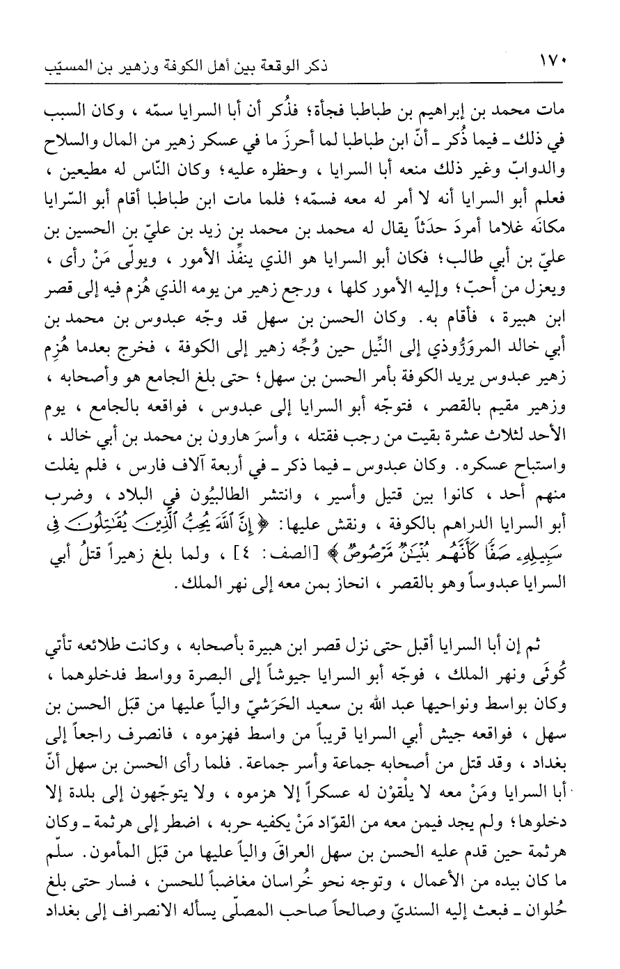 مات محمد بن إبراهيم بن طباطبا فجأة، فذُكر أن أبا السرايا سمّه، وكان السبب في ذلك - فيما ذُكر - أنّ ابن طباطبا لما أحرزَ ما في عسكر زهير من المال والسلاح والدوابّ وغير ذلك منعه أبا السرايا، وحظره عليه؛ وكان النّاس له مطيعين، فعلم أبو السرايا أنه لا أمر له معه فسمّه؛ فلما مات ابن طباطبا أقام أبو السّرايا مكانه غلاما أمردَ حدَثًا يقال له محمد بن محمد بن زيد بن عليّ بن الحسين بن عليّ بن أبي طالب؛ فكان أبو السرايا هو الذي ينفِّذ الأمور، ويولّى مَنْ رأى، ويعزل من أحبّ؛ وإليه الأمور كلها، ورجع زهير من يومه الذي هُزم فيه إلى قصر ابن هبيرة، فأقام به. وكان الحسن بن سهل قد وجّه عبدوس بن محمد بن أبي خالد المروَرُّوذي إلى النِّيل حين وُجِّه زهير إلى الكوفة، فخرج بعدما هُزِم زهير عبدوس يريد الكوفة بأمر الحسن بن سهل، حتى بلغ الجامع هو وأصحابه، وزهير مقيم بالقصر، فتوجّه أبو السرايا إلى عبدوس، فواقعه بالجامع، يوم الأحد لثلاث عشرة بقيت من رجب فقتله، وأسرَ هارون بن محمد بن أبي خالد، واستباح عسكره. وكان عبدوس - فيما ذكر - في أربعة آلاف فارس، فلم يفلت منهم أحد، كانوا بين قتيل وأسير، وانتشر الطالبيُون في البلاد، وضرب أبو السرايا الدراهم بالكوفة، ونقش عليها: {إِنَّ اللَّهَ يُحِبُّ الَّذِينَ يُقَاتِلُونَ فِي سَبِيلِهِ صَفًّا كَأَنَّهُمْ بُنْيَانٌ مَرْصُوصٌ} [الصف: ٤]، ولما بلغ زهيرًا قتلُ أبي السرايا عبدوسًا وهو بالقصر، انحاز بمن معه إلى نهر الملك.