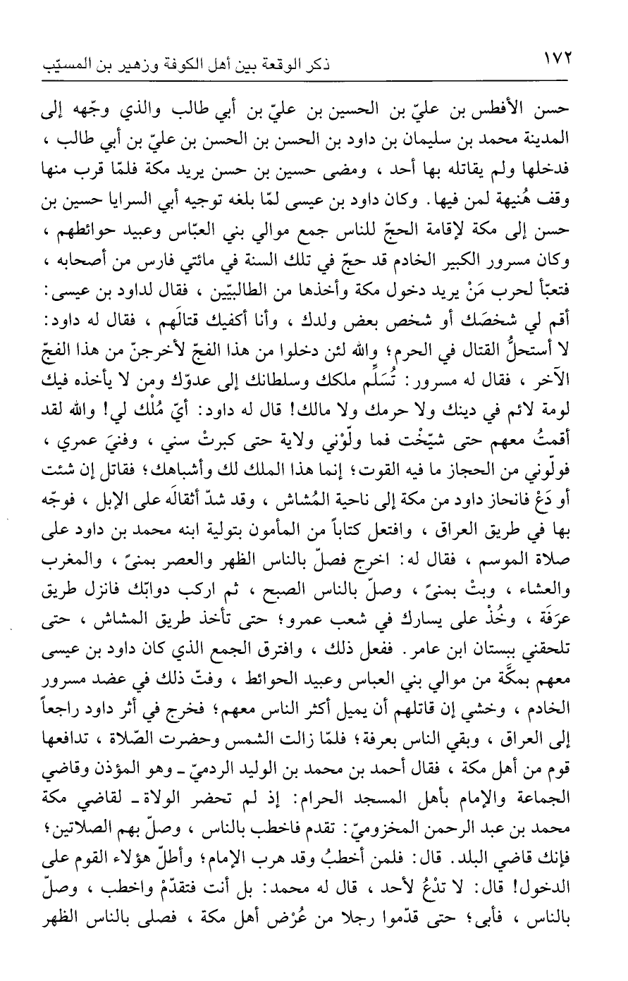 حسن الأفطس بن عليّ بن الحسين بن عليّ بن أبي طالب والذي وجّهه إلى المدينة محمد بن سليمان بن داود بن الحسن بن الحسن بن عليّ بن أبي طالب، فدخلها ولم يقاتله بها أحد، ومضى حسين بن حسن يريد مكة فلمّا قرب منها وقف هُنيهة من فيها. وكان داود بن عيسى لمّا بلغه توجيه أبي السرايا حسين بن حسن إلى مكة لإقامة الحجّ للناس جمع موالي بني العبّاس وعبيد حوائطهم، وكان مسرور الكبير الخادم قد حجّ في تلك السنة في مائتي فارس من أصحابه، فتعبّأ لحرب مَنْ يريد دخول مكة وأخذها من الطالبيّين، فقال لداود بن عيسى: أقم لي شخصَك أو شخص لعض ولدك، وأنا أكفيك قتالَهم، فقال له داود: لا أستحلُّ القتال في الحرم؛ والله لئن دخلوا من هذا الفجّ لأخرجنّ من هذا الفجّ الآخر، فقال له مسرور: تُسَلِّم ملكك وسلطانك إلى عدوّك ومن لا يأخذه فيك لومة لائم في دينك ولا حرمك ولا مالك! قال له داود: أيّ مُلْك لي! والله لقد أقمتُ معهم حتى شيّخْت فما ولّوْني ولاية حتى كبرتْ سني، وفنيَ عمري، فولّوني من الحجاز ما فيه القوت؛ إنما هذا الملك لك وأشباهك، فقاتل إن شئت أو دَعْ فانحاز داود من مكة إلى ناحية المُشاش، وقد شدّ أثقالَه على الإبل، فوجّه بها في طريق العراق، وافتعل كتابًا من المأمون بتولية ابنه محمد بن داود على صلاة الموسم، فقال له: اخرج فصلّ بالناس الظهر والعصر بمنىً، والمغرب والعشاء، وبتْ بمنىً، وصلّ بالناس الصبح، ثم اركب دوابّك فانزل طريق عرَفَة، وخُذْ على يسارك في شعب عمرو؛ حتى تأخذ طريق المشاش، حتى تلحقني ببستان ابن عامر. ففعل ذلك، وافترق الجمع الذي كان داود بن عيسى معهم بمكَّة من موالي بني العباس وعبيد الحوائط، وفتّ ذلك في عضد مسرور الخادم، وخشي إن قاتلهم أن يميل أكثر الناس معهم، فخرج في أثر داود راجعًا إلى العراق، وبقي الناس بعرفة؛ فلمّا زالت الشمس وحضرت الصّلاة، تدافعها قوم من أهل مكة، فقال أحمد بن محمد بن الوليد الردميّ - وهو المؤذن وقاضي الجماعة والإمام بأهل المسجد الحرام: إذ لم تحضر الولاة - لقاضي مكة محمد بن عبد الرحمن المخزوميّ: تقدم فاخطب بالناس، وصلّ بهم الصلاتين؛ فإنك قاضي البلد. قال: فلمن أخطبُ وقد هرب الإمام؛ وأطلّ هؤلاء القوم على الدخول! قال: لا تدْعُ لأحد، قال له محمد: بل أنت فتقدّمْ واخطب، وصلّ بالناس، فأبى؛ حتى قدّموا رجلا من عُرْض أهل مكة، فصلى بالناس الظهر