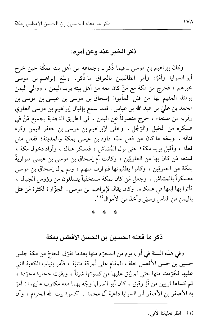 وفي هذه السنة في أول يوم من المحرّم منها بعدما لفرّق الحاجّ من مكة جلس حسين بن حسن الأفطس خلف المقام على نُمرقة مثنيّة، فأمر بثياب الكعبة التي عليها فجُرّدت منها حتى لم يُبق عليها من كسوتها شيئًا، وبقيَت حجارة مجرّدة، ثم كساها ثوبين من قَزّ رقيق، كان أبو السرايا وجّه بهما معه مكتوب عليهما: أمرَ به الأصفر بن الأصفر أبو السرايا داعية آل محمد، لكسوة بيت الله الحرام، وأن
