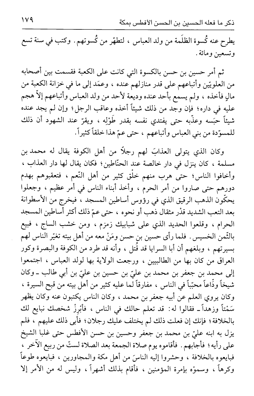 ثم أمر حسين بن حسن بالكسوة التي كانت على الكعبة فقسمت بين أصحابه من العلويّين وأتباعهم على قدر منازلهم عنده، وعمَد إلى ما في خزانة الكعبة من مالٍ فأخذه، ولم يسمع بأحد عنده وديعة لأحد من ولد العباس وأتباعهم إلّا هجم عليه في داره؛ فإن وجد من ذلك شيئًا أخذه وعاقب الرجل؛ وإن لم يجد عنده شيئًا حبَسه وعذّبه حتى يفتدي نفسه بقدر طَوْله، ويقرّ عند الشهود أن ذلك للمسوّدة من بني العباس وأتباعهم، حتى عمّ هذا خلقًا كثيرًا.