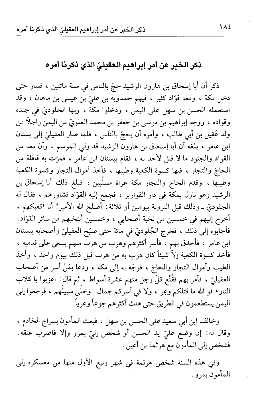 ذكر أن أبا إسحاق بن هارون الرشيد حجّ بالناس في سنة مائتين، فسار حتى دخل مكة، ومعه قوّاد كثير، فيهم حمدويه بن عليّ بن عيسى بن ماهان، وقد استعمله الحسن بن سهل على اليمن، ودخلوا مكة، وبها الجلوديّ في جنده وقواده، ووجه إبراهيم بن موسى بن جعفر بن محمد العلويّ من اليمن راجلًا من ولد عَقيل بن أبي طالب، وأمره أن يحجّ بالناس، فلما صار العميليّ إلى بستان ابن عامر، بلغه أن أبا إسحاق بن هارون الرشيد قد ولي الموسم، وأن معه من القواد والجنود ما لا قبل لأحد به، فقام ببستان ابن عامر، فمرّت به قافلة من الحاجّ والتجار، فيها كسوة الكعبة وطيبها، فأخذ أموال التجار وكسوة الكعبة وطيبها، وقدم الحاج والتجار مكة عراة مسلّبين، فبلغ ذلك أبا إسحاق بن الرشيد وهو نازل بمكة في دار القوارير، فجمع إليه القوّاد فشاورهم، فقال له الجلوديّ - وذلك قبل التروية بيومين أو ثلاثة: أصلح الله الأمير! أنا أكفيكهم، أخرج إليهم في خمسين من نخبة أصحابي، وخمسين أنتخبهم من سائر القوّاد. فأجابوه إلى ذلك، فخرج الجُلوديّ في مائة حتى صبّح العقيليّ وأصحابه ببستان ابن عامر، فأحدق بهم، فأسر أكثرهم وهرب من هرب منهم يسعى على قدميه، فأخذ كسوة الكعبة إلّا شيئًا كان هرب به من هرب قبل ذلك بيوم واحد، وأخذ الطيب وأموال التجار والحافي، فوجّه به إلى مكة، ودعا بمَنْ أسر من أصحاب العقيليّ، فأمر بهم فقُنِّع كلّ رجل منهم عشرة أسواط، ثم قال: اعزبوا يا كلاب النار؛ فولله ما قتلكم وعِر، ولا في أسركم جمال. وخلّى سبيلَهم، فرجعوا إلى اليمن يستطعمون في الطريق حتى هلك أكثرهم جوعًا وعريًا.