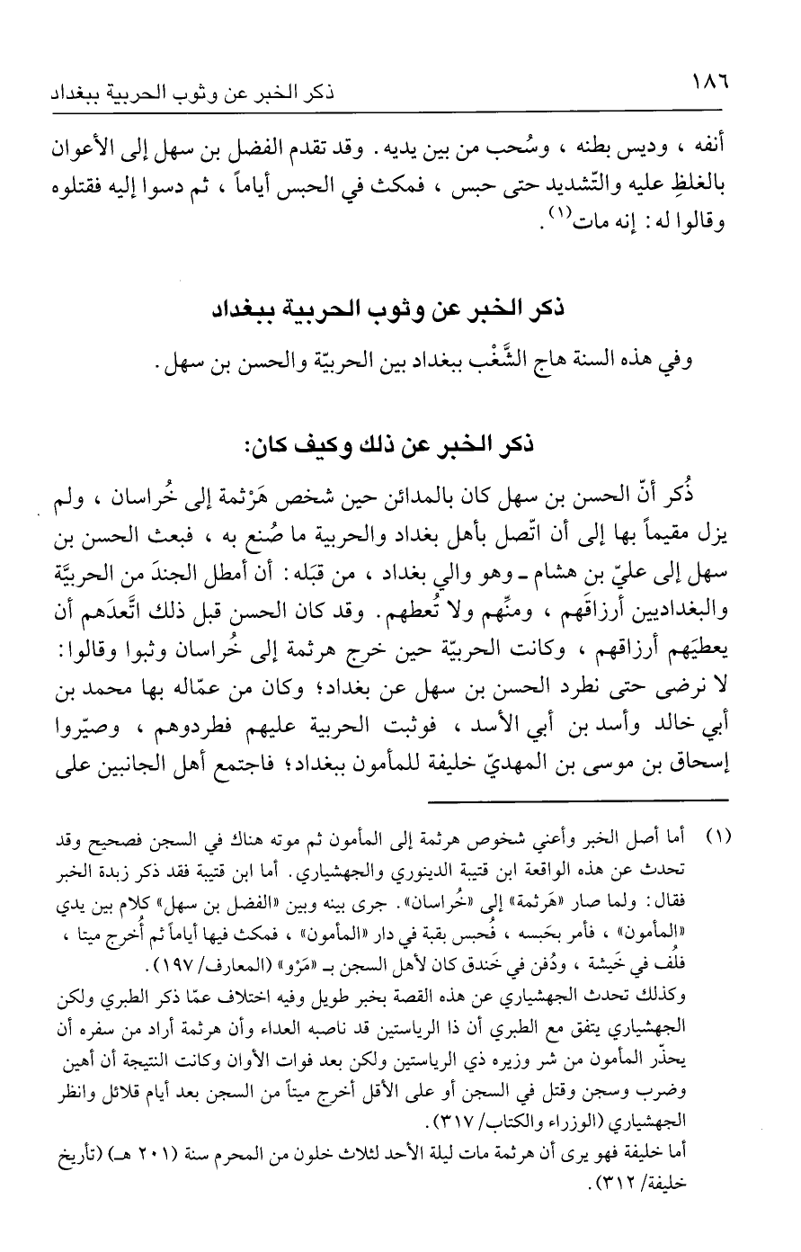 وفي هذه السنة هاج الشَّغْب ببغداد بين الحربيّة والحسن بن سهل.