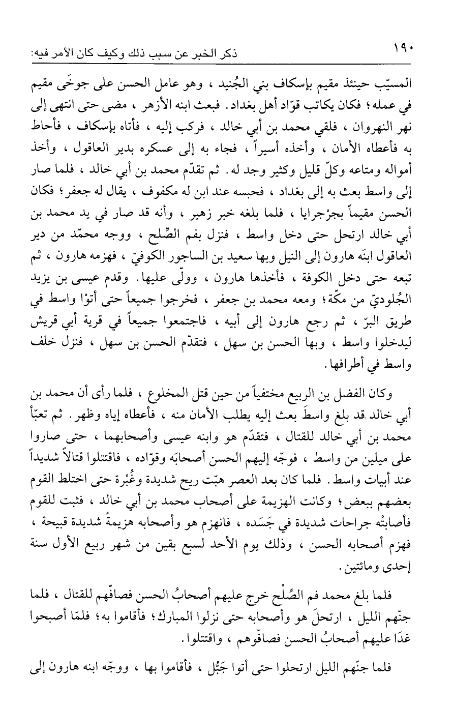 وكان الفضل بن الربيع مختفيًا من حين قتل المخلوع، فلما رأى أن محمد بن أبي خالد. قد بلغ واسطَ بعث إليه يطلب الأمان منه، فأعطاه إياه وظهر. ثم تعبّأ محمد بن أبي خالد للقتال، فتقدّم هو وابنه عيسى وأصحابهما، حتى صاروا على ميلين من واسط، فوجّه إليهم الحسن أصحابَه وقوّاده، فاقتتلوا قتالًا شديدًا عند أبيات واسط. فلما كان بعد العصر هبّت ريح شديدة وغُبْرة حتى اختلط القوم بعضهم ببعض، وكانت الهزيمة على أصحاب محمد بن أبي خالد، فثبت للقوم فأصابتْه جراحات شديدة في جَسَده، فانهزم هو وأصحابه هزيمةً شديدة قبيحة، فهزم أصحابه الحسن، وذلك يوم الأحد لسبع بقين من شهر ربيع الأول سنة إحدى ومائتين.
