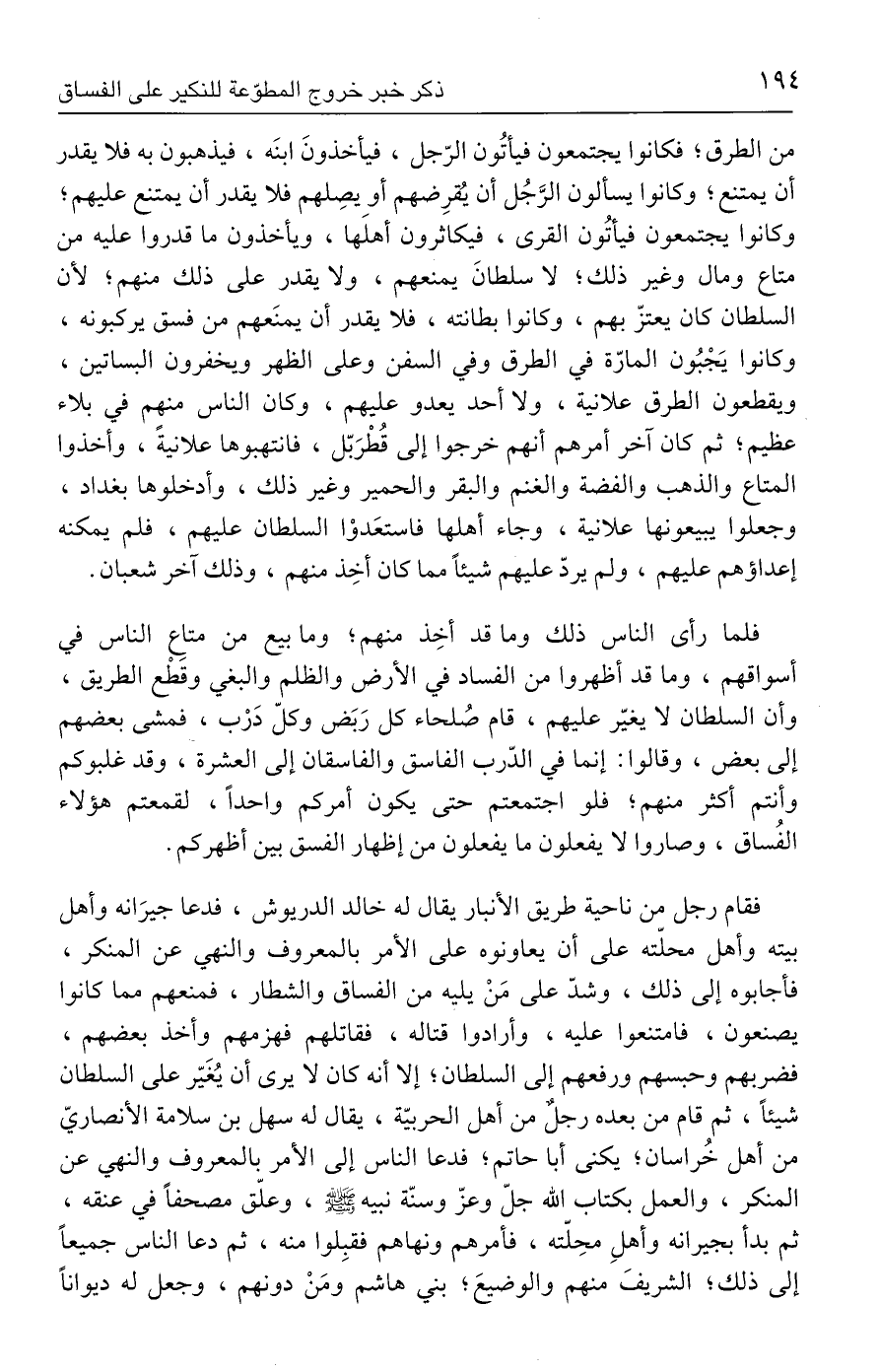 فلما رأى الناس ذلك وما قد أخِذ منهم؛ وما بيع من متاعِ الناس في أسواقهم، وما قد أظهروا من الفساد في الأرض والظلم والبغي وقَطْع الطريق، وأن السلطان لا يغيّر عليهم، قام صُلحاء كل رَبَض وكلّ دَرْب، فمشى بعضهم إلى بعض، وقالوا: إنما في الدّرب الفاسق والفاسقان إلى العشرة، وقد غلبوكم وأنتم أكتر منهم؛ فلو اجتمعتم حتى يكون أمركم واحدًا، لقمعتم هؤلاء الفُساق، وصاروا لا يفعلون ما يفعلون من إظهار الفسق بين أظهركم.