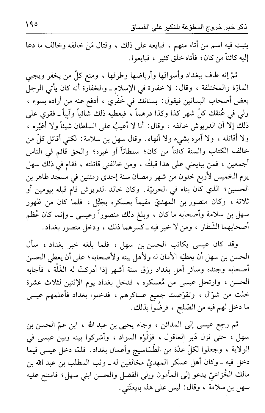 ثمّ إنه طاف ببغداد وأسواقها وأرباضها وطرقها، ومنع كلّ من يخفر ويجبي المارّة والمختلفة، وقال: لا خفارة في الإسلام - والخفارة أنه كان يأتي الرجل بعض أصحاب البساتين فيقول: بستانك في خَفري، أدفع عنه من أراده بسوء، ولي في عُنقك كلّ شهر كذا وكذا درهمًا، فيعطيه ذلك شائيًا وآبِيًا - فقوي على ذلك إلا أن الدريوش خالفه، وقال: أنا لا أعيبُ على السلطان شيئًا ولا أغيِّره، ولا أقاتله، ولا آمره بشيء ولا أنهاه. وقال سهل بن سلامة: لكني أقاتل كلّ من خالف الكتاب والسنة كائنًا من كان؛ سلطانًا أو غيره؛ والحق قائم في الناس أجمعين، فمن يبايعني على هذا قبلتُه، ومن خالفني قاتلته، فقام في ذلك سهل يوم الخميس لأربع خلون من شهر رمضان سنة إحدى ومئتين في مسجد طاهر بن الحسين؛ الذي كان بناه في الحربيّة. وكان خالد الدريوش قام قبله بيومين أو ثلاثة، وكان منصور بن المهديّ مقيمًا بعسكره بجَبُّل، فلما كان من ظهور سهل بن سلامة وأصحابه ما كان، وبلغ ذلك منصورًا وعيسى - وإنما كان عُظم أصحابهما الشّطار، ومن لا خير فيه - كسرهما ذلك، ودخل منصور بغداد.