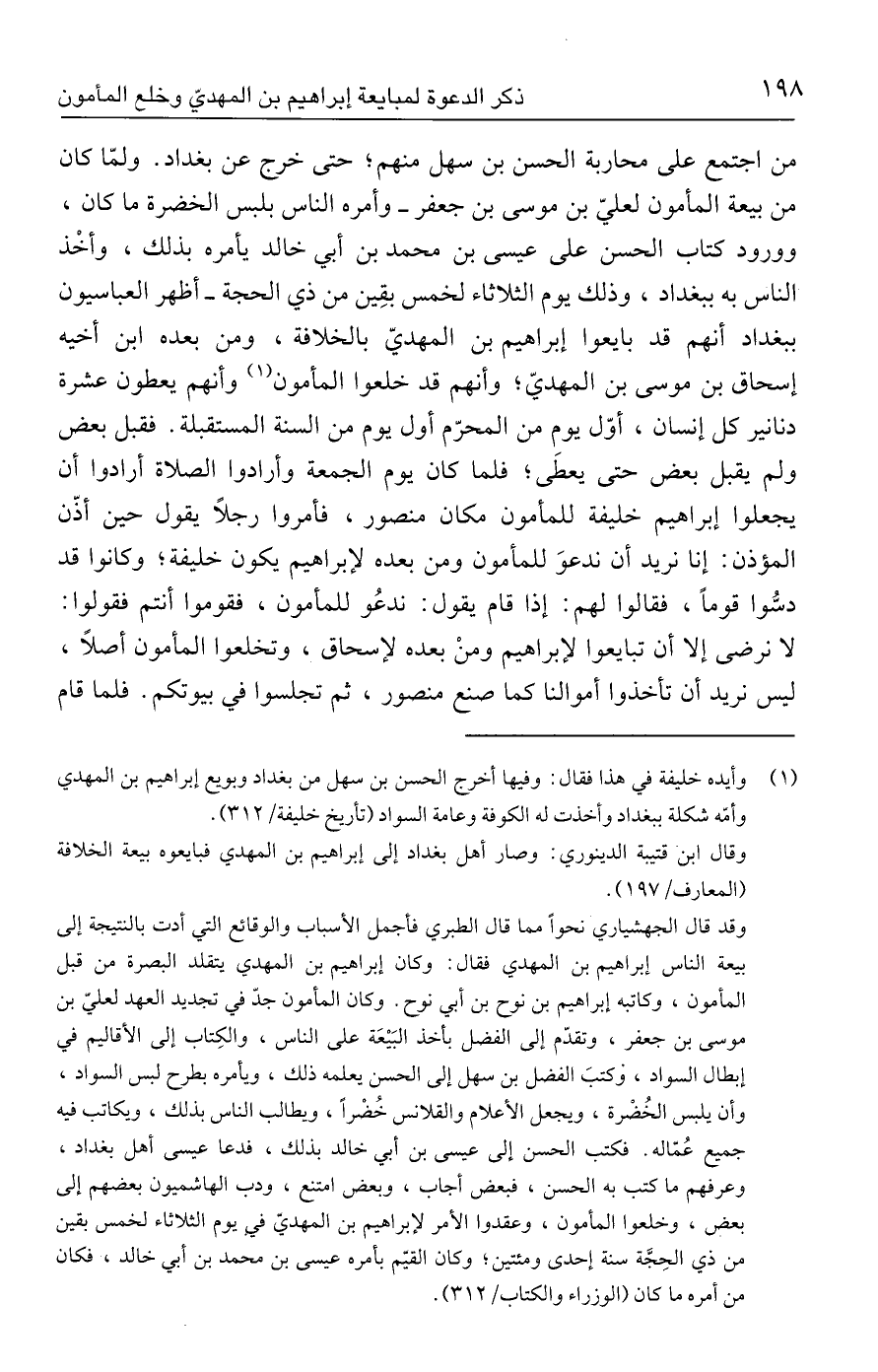 وقد قال الجهشياري نحوًا مما قال الطبري فأجمل الأسباب والوقائع التي أدت بالنتيجة إلى بيعة الناس إبراهيم بن المهدي فقال: وكان إبراهيم بن المهدي يتقلد البصرة من قبل المأمون، وكاتبه إبراهيم بن نوح بن أبي نوح. وكان المأمون جدّ في تجدبد العهد لعليّ بن موسى بن جعفر، وتقدّم إلى الفضل بأخذ البَيْعَة على الناس، والكِتاب إلى الأقاليم في إبطال السواد، وكتبَ الفضل بن سهل إلى الحسن يعلمه ذلك، ويأمره بطرح لبس السواد، وأن يلبس الخُضْرة، ويجعل الأعلام والقلانس خُضْرًا، ويطالب الناس بذلك، ويكاتب فيه جميع عُمّاله. فكتب الحسن إلى عيسى بن أبي خالد بذلك، فدعا عيسى أهل بغداد، وعرفهم ما كتب به الحسن، فبعض أجاب، وبعض امتنع، ودب الهاشميون بعضهم إلى بعض، وخلعوا المأمون، وعقدوا الأمر لإبراهيم بن المهديّ في يوم الثلاثاء لخمس بقين من ذي الحِجَّة سنة إحدى ومئتين؛ وكان القيّم بأمره عيسى بن محمد بن أبي خالد، فكان من أمره ما كان (الوزراء والكتاب/ ٣١٢).