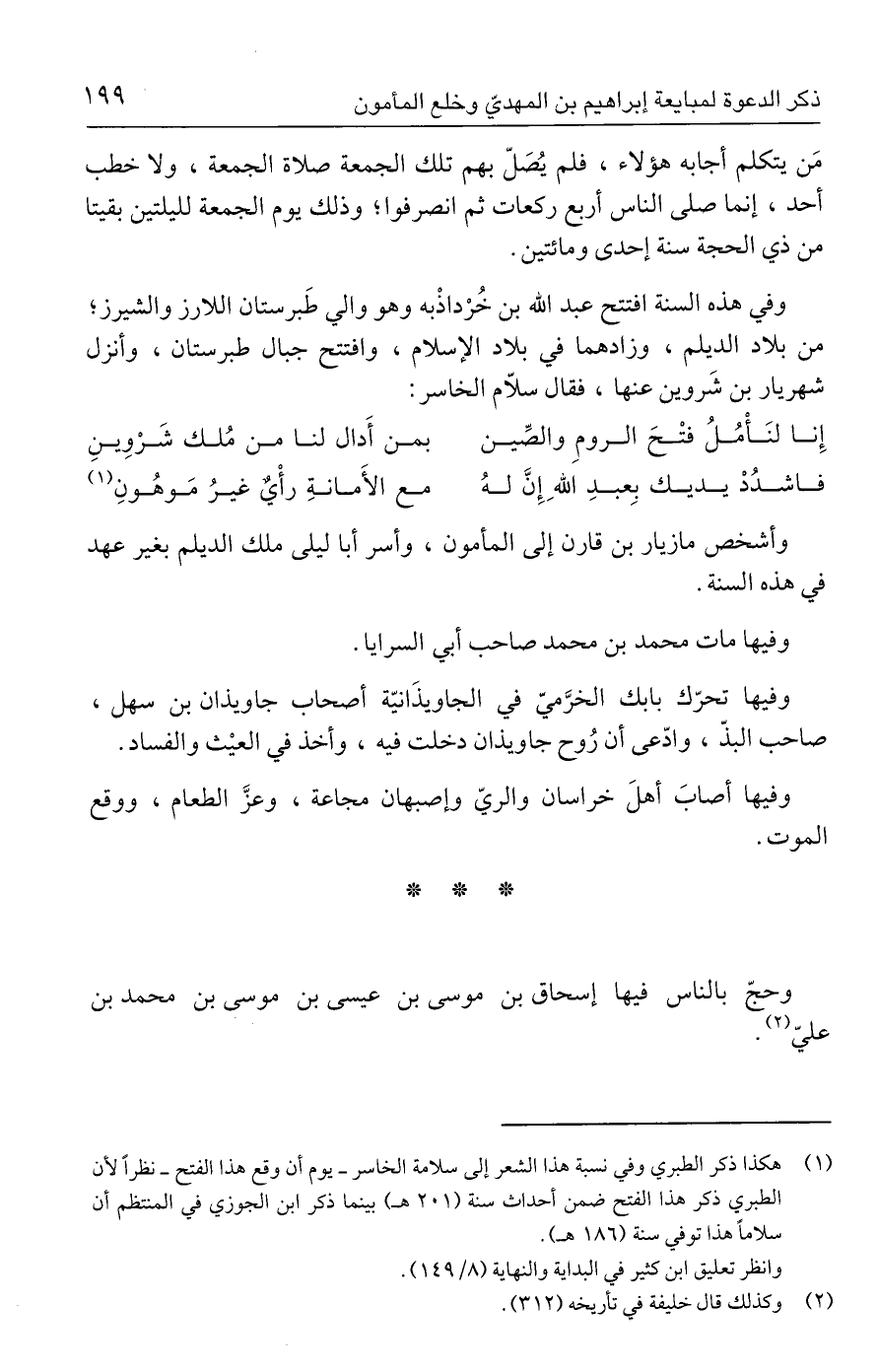 (١) هكذا ذكر الطبري وفي نسبة هذا الشعر إلى سلامة الخاسر - يوم أن وقع هذا الفتح - نظرًا لأن الطبري ذكر هذا الفتح ضمن أحداث سنة (٢٠١ هـ) بينما ذكر ابن الجوزي في المنتظم أن سلامًا هذا توفي سنة (١٨٦ هـ).