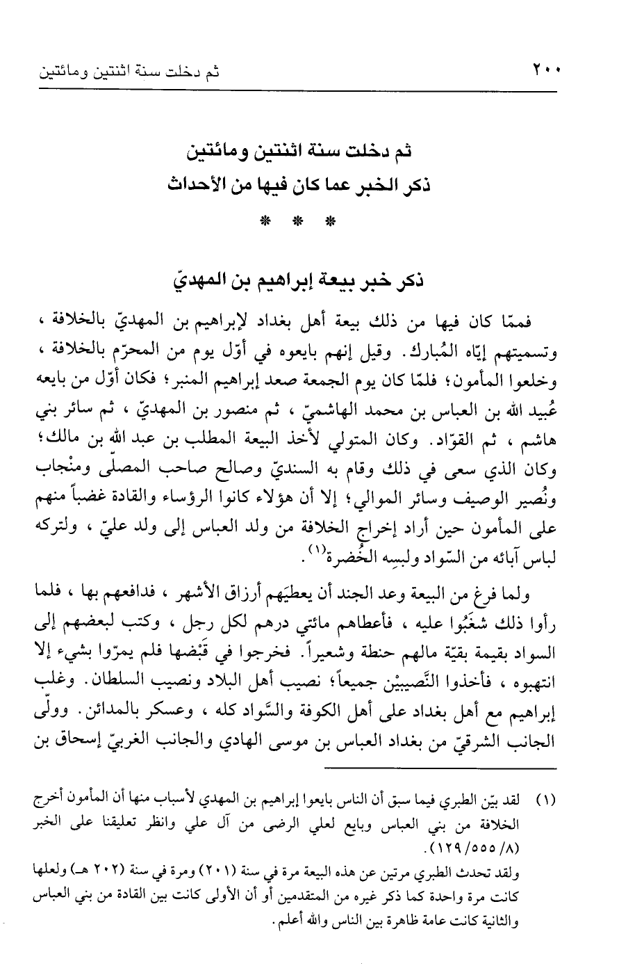 فممّا كان فيها من ذلك بيعة أهل بغداد لإبراهيم بن المهديّ بالخلافة، وتسميتهم إيّاه المُبارك. وقيل إنهم بايعوه في أوّل يوم من المحرّم بالخلافة، وخلعوا المأمون؛ فلمّا كان يوم الجمعة صعد إبراهيم المنبر؛ فكان أوّل من بايعه عُبيد الله بن العباس بن محمد الهاشميّ، ثم منصور بن المهديّ، ثم سائر بني هاشم، ثم القوّاد. وكان المتولي لأخذ البيعة المطلب بن عبد الله بن مالك، وكان الذي سعى في ذلك وقام به السنديّ وصالح صاحب المصلّى ومنْجاب ونُصير الوصيف وسائر الموالي؛ إلا أن هؤلاء كانوا الرؤساء والقادة غضبًا منهم على المأمون حين أراد إخراج الخلافة من ولد العباس إلى ولد عليّ، ولتركه لباس آبائه من السّواد ولبسِه الخُضرة (١).