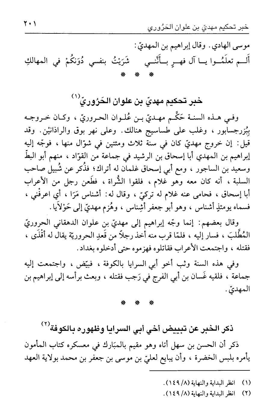 وفي هذه السنة حَكَّم مهديّ بن عُلوان الحروريّ، وكان خروجه بِبُزرجسابور، وغلب على طساسيج هنالك. وعلى نهر بوق والراذانيْن. وقد قيل: إن خروج مهديّ كان في سنة ثلاث ومئتين في شوّال منها، فوجّه إليه إبراهيم بن المهدي أبا إسحاق بن الرشيد في جماعة من القوّاد، منهم أبو البطّ وسعيد بن الساجور، ومع أبي إسحاق غلمان له أتراك؛ فذُكر عن شُبيل صاحب السلبة، أنه كان معه وهو غلام، فلقوا الشُّراة، فطَعن رجل من الأعراب أبا إسحاق، فحامى عنه غلام له تركيّ، وقال له: أشناس مَرَا، أي اعرفْني، فسماه يومئذٍ أشناس، وهو أبو جعفر أشِناس، وهُزم مهديّ إلى حّوْلَايا.