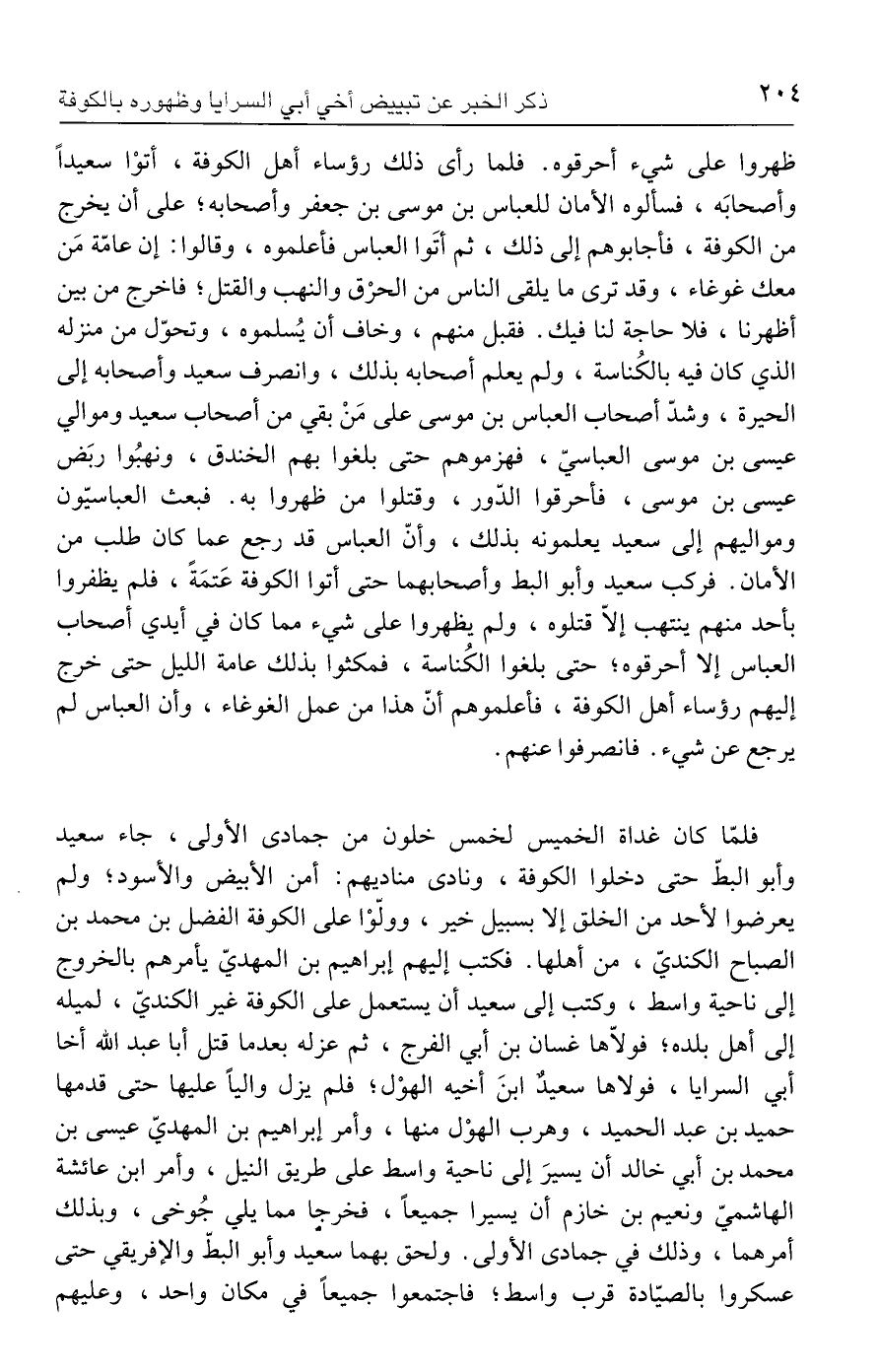 ظهروا على شيء أحرقوه. فلما رأى ذلك رؤساء أهل الكوفة، أتوْا سعيدًا وأصحابَه، فسألوه الأمان للعباس بن موسى بن جعفر وأصحابه؛ على أن يخرج من الكوفة، فأجابوهم إلى ذلك، ثم أتَوا العباس فأعلموه، وقالوا: إن عامّة مَن معك غوغاء، وقد ترى ما يلقى الناس من الحرْق والنهب والقتل؛ فاخرج من بين أظهرنا، فلا حاجة لنا فيك. فقبل منهم، وخاف أن يُسلموه، وتحوّل من منزله الذي كان فيه بالكُناسة، ولم يعلم أصحابه بذلك، وانصرف سعيد وأصحابه إلى الحيرة، وشدّ أصحاب العباس بن موسى على مَنْ بقي من أصحاب سعيد وموالي عيسى بن موسى العباسيّ، فهزموهم حتى بلغوا بهم الخندق، ونهبُوا ربَض عيسى بن موسى، فأحرقوا الدّور، وقتلوا من ظهروا به. فبعث العباسيّون ومواليهم إلى سعيد يعلمونه بذلك، وأنّ العباس قد رجع عما كان طلب من الأمان. فركب سعيد وأبو البط وأصحابهما حتى أتوا الكوفة عَتمَةً، فلم يظفروا بأحد منهم ينتهب إلّا قتلوه، ولم يظهروا على شيء مما كان في أيدي أصحاب العباس إلا أحرقوه؛ حتى بلغوا الكُناسة، فمكثوا بذلك عامة الليل حتى خرج إليهم رؤساء أهل الكوفة، فأعلموهم أنّ هذا من عمل الغوغاء، وأن العباس لم يرجع عن شيء. فانصرفوا عنهم.
