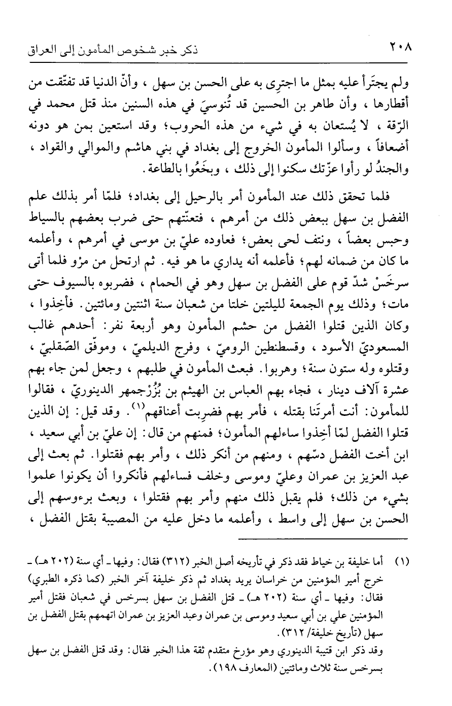 (١) أما خليفة بن خياط فقد ذكر في تأريخه أصل الخبر (٣١٢) فقال: وفيها - أي سنة (٢٠٢ هـ) - خرج أمير المؤمنين من خراسان يريد بغداد ثم ذكر خليفة آخر الخبر (كما ذكره الطبري) فقال: وفيها - أي سنة (٢٠٢ هـ) - قتل الفضل بن سهل بسرخس في شعبان فقتل أمير المؤمنين علي بن أبي سعيد وموسى بن عمران وعبد العزيز بن عمران اتهمهم بقتل الفضل بن سهل (تأريخ خليفة/ ٣١٢).