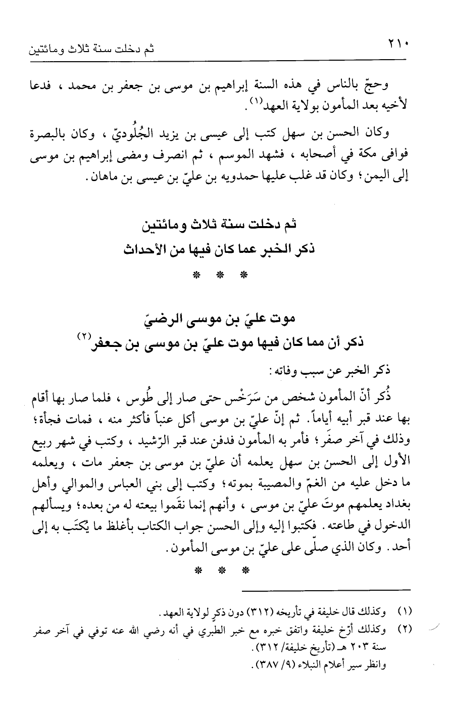 (٢) وكذلك أرّخ خليفة واتفق خبره مع خبر الطبري في أنه رضي الله عنه توفي في آخر صفر سنة ٢٠٣ هـ (تأريخ خليفة/ ٣١٢).
