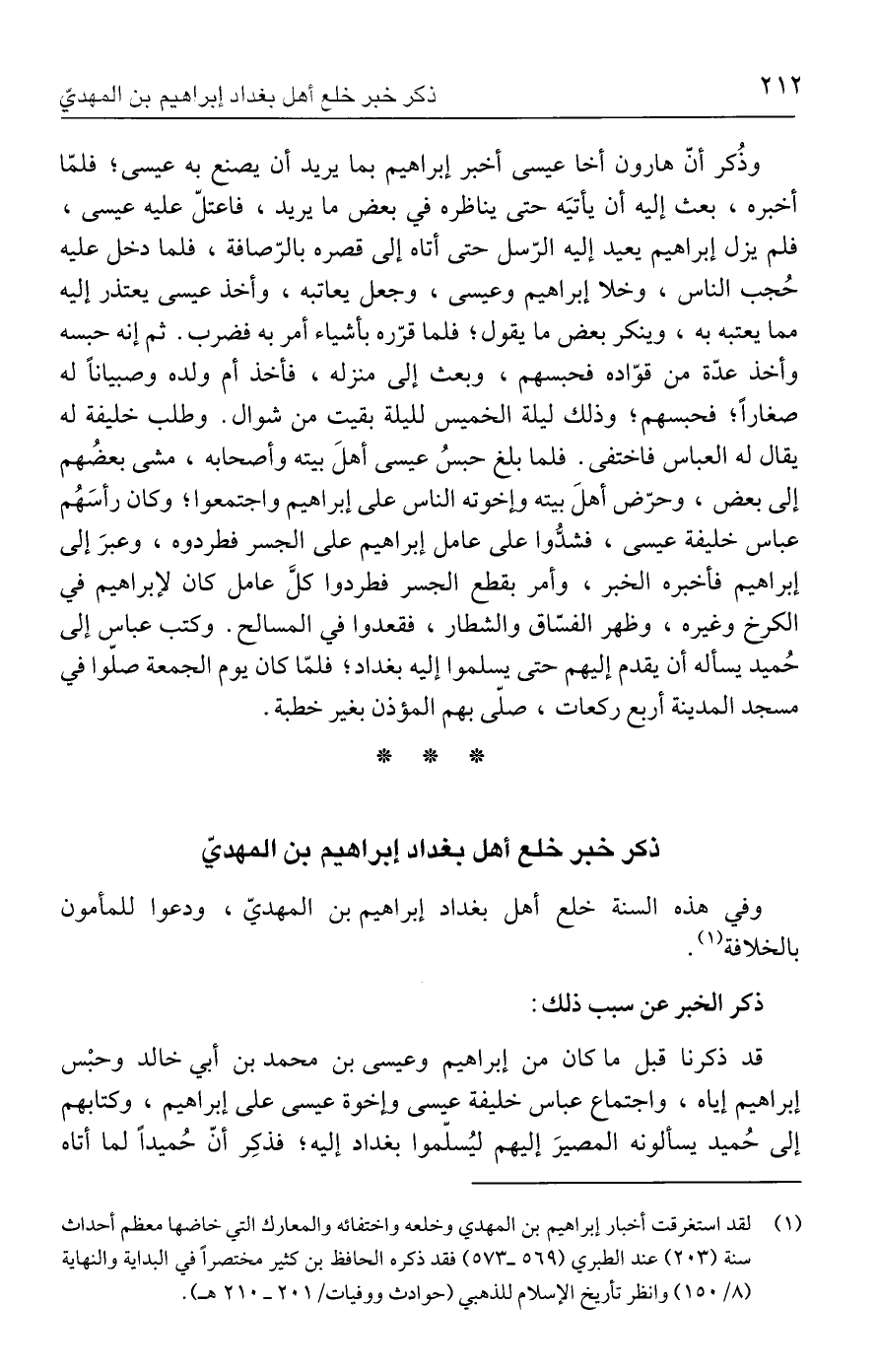 (١) لقد استغرقت أخبار إبراهيم بن المهدي وخلعه واختفائه والمعارك التي خاضها معظم أحداث سنة (٢٠٣) عند الطبري (٥٦٩ - ٥٧٣) فقد ذكره الحافظ بن كثير مختصرًا في البداية والنهاية (٨/ ١٥٠) وانظر تأريخ الإسلام للذهبي (حوادث ووفيات/ ٢٠١ - ٢١٠ هـ).