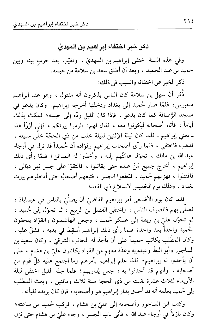 وفي هذه السنة اختفى إبراهيم بن المهديّ، وتغيّب بعد حربٍ بينه وبين حميد بن عبد الحميد، وبعد أن أطلق سعد بن سلامة من حبسه.