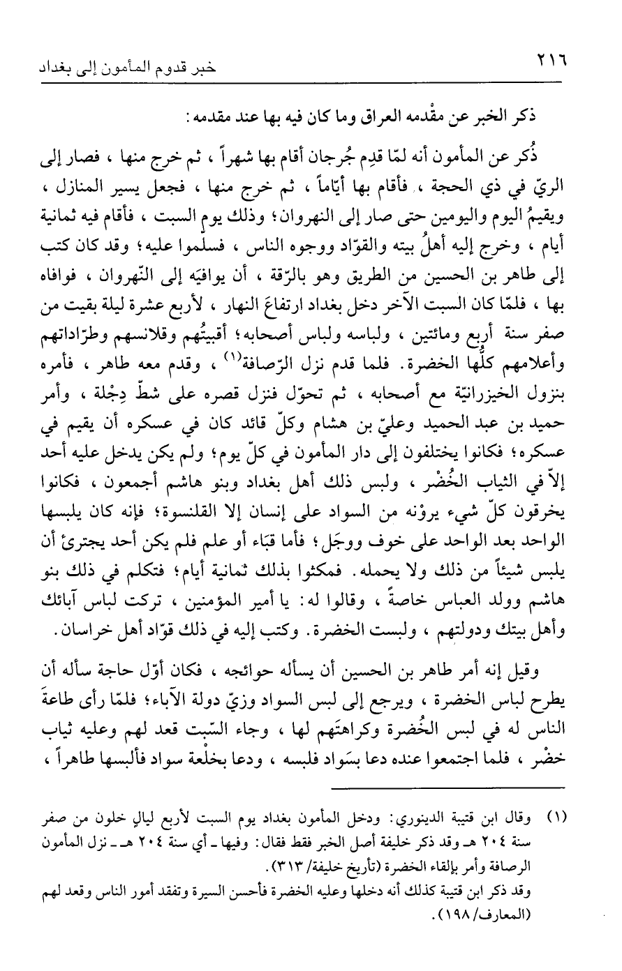 (١) وقال ابن قتيبة الدينوري: ودخل المأمون بغداد يوم السبت لأربع ليالي خلون من صفر سنة ٢٠٤ هـ وقد ذكر خليفة أصل الخبر فقط فقال: وفيها - أي سنة ٢٠٤ هـ - نزل المأمون الرصافة وأمر بإلقاء الخضرة (تأريخ خليفة/ ٣١٣).