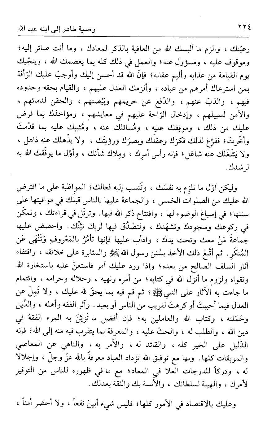 وليكن أوّل ما تلزِم به نفسَك، وتَنسب إليه فعالك؛ المواظبة على ما افترض الله عليك من الصلوات الخمس، والجماعة عليها بالناس قبلك في مواقيتها على سننها؛ في إسباغ الوضوء لها، وافتتاح ذكر الله فيها. وترتّل في قراءتك، وتمكّن في ركوعك وسجودك وتشهّدك، ولتصْدُق فيها لربك نيَّتُك. واحضض عليها جماعةَ مَنْ معك وتحت يدك، وادأب عليها فإنها تأمُرُ بالمَعْروفِ وَتَنْهَى عَن المُنكَرِ. ثم أتَّبعْ ذلك الأخذ بسُنن رسول الله - صلى الله عليه وسلم - والمثابرة على خلائقه، واقتفاء آثار السلف الصالح من بعده؛ وإذا ورد عليك أمر فاستعنْ عليه باستخارة الله وتقواه ولزوم ما أنزل الله في كتابه؛ من أمره ونهيه، وحلاله وحرامه، وائتمام ما جاءت به الآثار على النبي - صلى الله عليه وسلم -؛ ثم قم فيه بما يحقّ لله عليك، ولا تَمِلْ عن العدل فيما أحببتَ أو كرهتَ لقريب من الناس أو بعيد. وآثر الفقه وأهله، والدِّين وحَمَلته، وكتاب الله والعاملين به؛ فإن أفضل ما تَزيَّنَ به المرء الفقهُ في دين الله، والطلب له، والحثّ عليه، والمعرفة بما يتقرب فيه منه إلى الله؛ فإنه الدّليل على الخير كله، والقائد له، والآمر به، والناهي عن المعاصي والموبقات كلها. وبها مع توفيق الله تزداد العباد معرفةً بالله عزّ وجلّ، وإجلالا له، ودركًا للدرجات العلا في المعاد؛ مع ما في ظهوره للناس من التوقير لأمرك، والهيبة لسلطانك، والأنسة بك والثقة بعدلك.