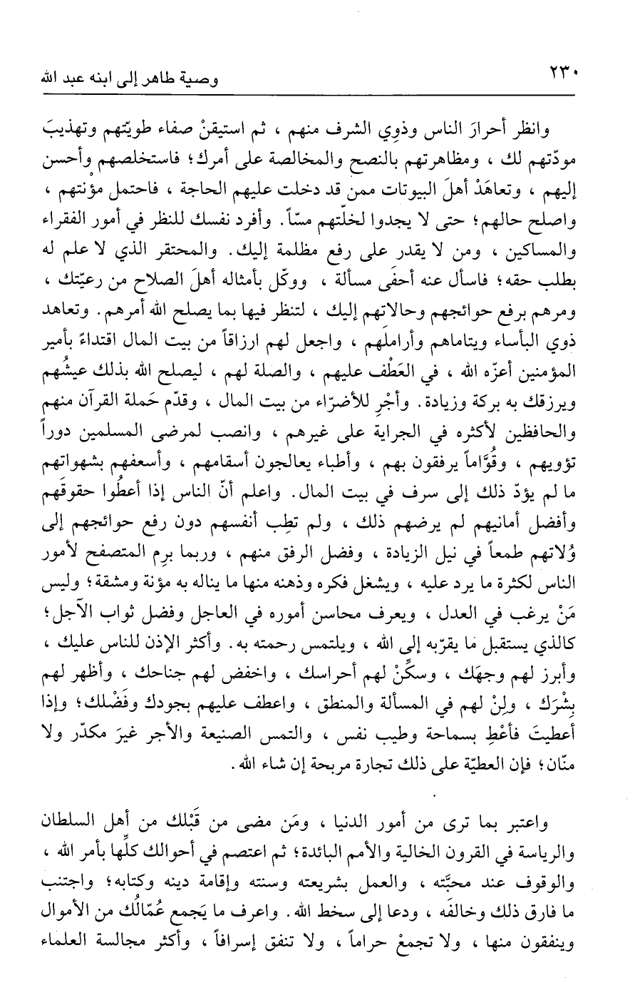 وانظر أحرارَ الناس وذوِي الشرف منهم، ثم استيقنْ صفاء طويّتهم وتهذيبَ مودّتهم لك، ومظاهرتهم بالنصح والمخالصة على أمرك، فاستخلصهم وأحسن إليهم، وتعاهَدْ أهلَ البيوتات ممن قد دخلت عليهم الحاجة، فاحتمل مؤْنتهم، واصلح حالهم؛ حتى لا يجدوا لخلّتهم مسًّا. وأفرد نفسك للنظر في أمور الفقراء والمساكين، ومن لا يقدر على رفع مظلمة إليك. والمحتقر الذي لا علم له بطلب حقه؛ فاسأل عنه أحفَى مسألة، ووكّل بأمثاله أهلَ الصلاح من رعيّتك، ومرهم برفع حوائجهم وحالاتهم إليك، لتنظر فيها بما يصلح الله أمرهم. وتعاهد ذوي البأساء ويتاماهم وأراملَهم، واجعل لهم أرزاقًا من بيت المال اقتداءً بأمير المؤمنين أعزّه الله، في العَطْف عليهم، والصلة لهم، ليصلح الله بذلك عيشُهم ويرزقك به بركة وزيادة. وأجْرِ للأضرّاء من بيت المال، وقدّم حَملة القرآن منهم والحافظين لأكثره في الجراية على غيرهم، وانصب لمرضى المسلمين دورًا تؤويهم، وقُوَّامًا يرفقون بهم، وأطباء يعالجون أسقامهم، وأسعفهم بشهواتهم ما لم يؤدّ ذلك إلى سرف في بيت المال. واعلم أنّ الناس إذا أعطُوا حقوقَهم وأفضل أمانيهم لم يرضهم ذلك، ولم تطِب أنفسهم دون رفع حوائجهم إلى وُلاتهم طمعًا في نيل الزيادة، وفضل الرفق منهم، وربما برِم المتصفح لأمور الناس لكثرة ما يرد عليه، ويشغل فكره وذهنه منها ما يناله به مؤنة ومشقة؛ وليس مَنْ يرغب في العدل، ويعرف محاسن أموره في العاجل وفضل ثواب الآجل؛ كالذي يستقبل ما يقرّبه إلى الله، ويلتمس رحمته به. وأكثر الإذن للناس عليك، وأبرز لهم وجهَك، وسكِّنْ لهم أحراسك، واخفض لهم جناحك، وأظهر لهم بشْرَك، ولنْ لهم في المسألة والمنطق، واعطف عليهم بجودك وفَضْلك؛ وإذا أَعطيتَ فأعْطِ بسماحة وطيب نفس، والتمس الصنيعة والأجر غيرَ مكدّر ولا منّان؛ فإن العطيّة على ذلك تجارة مربحة إن شاء الله.