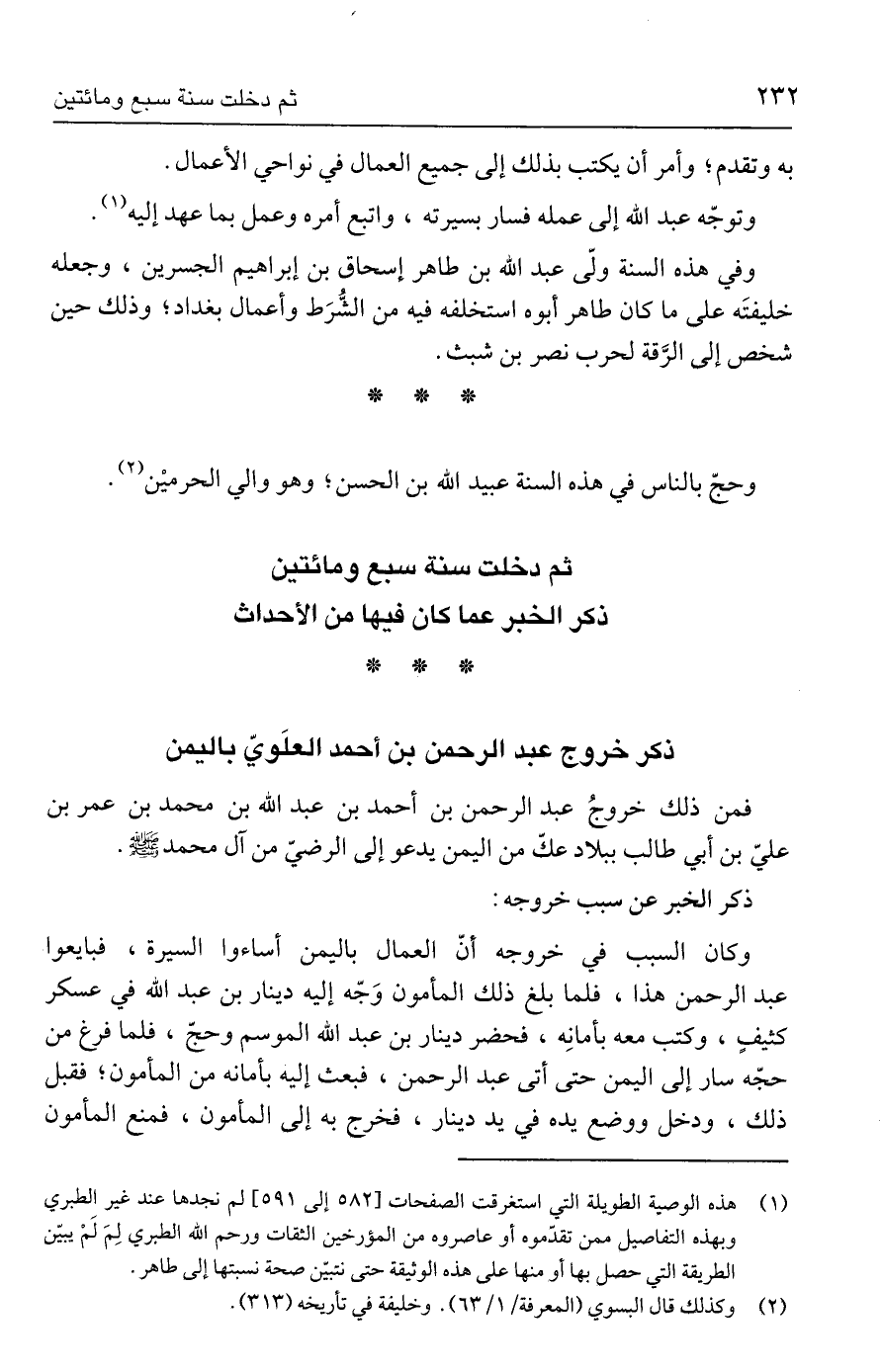 (١) هذه الوصية الطويلة التي استغرقت الصفحات [٥٨٢ إلى ٥٩١] لم نجدها عند غير الطبري وبهذه التفاصيل ممن تقدّموه أو عاصروه من المؤرخين الثقات ورحم الله الطبرىِ لِمَ لَمْ يبيّن الطربقة التي حصل بها أو منها على هذه الوثيقة حتى نتبيّن صحة نسبتها إلى طاهر.