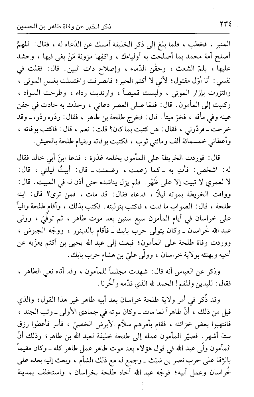 قال: فوردت الخريطة على المأمون بخلعه غدْوة، فدعا ابنَ أبي خالد فقال له: اشخص: فأتِ به - كما زعمت، وضمنت - قال: أبيتُ ليلتي، قال: لا لعمري لا تبيت إلا على ظَهْر. فلم يزل يناشده حتى أذن له في المبيت. قال: ووافت الخريطة بموته ليلًا، فدعاه فقال: قد مات، فمن ترى؟ قال: ابنه طلحة، قال: الصواب ما قلت، فاكتب بتوليته. فكتب بذلك، وأقام طلحة واليًا على خراسان في أيام المأمون سبع سنين بعد موت طاهر، ثم توفِّيَ، وولى عبد الله خُراسان - وكان يتولى حرب بابك - فأقام بالدينور، ووجّه الجيوش، ووردت وفاة طلحة على المأمون، فبعث إلى عبد الله يحيى بن أكثم يعزّيه عن أخيه ويهنئه بولاية خراسان، وولّى عليّ بن هشام حرب بابك.