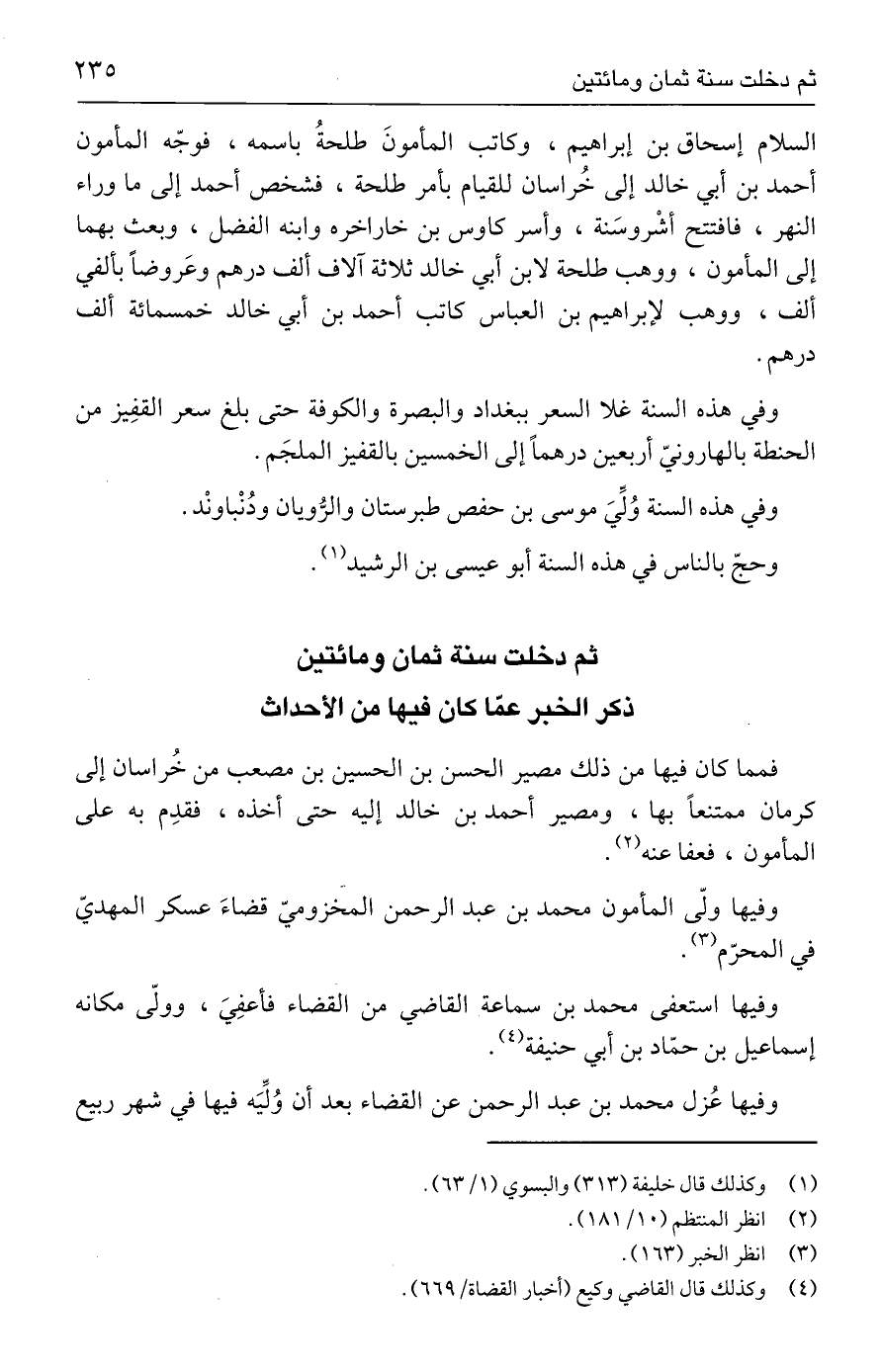 السلام إسحاق بن إبراهيم، وكاتب المأمونَ طلحةُ باسمه، فوجّه المأمون أحمد بن أبي خالد إلى خُراسان للقيام بأمر طلحة، فشخص أحمد إلى ما وراء النهر، فافتتح أشْروسَنة، وأسر كاوس بن خاراخره وابنه الفضل، وبعث بهما إلى المأمون، ووهب طلحة لابن أبي خالد ثلاثة آلاف ألف درهم وعَروضًا بألفي ألف، ووهب لإبراهيم بن العباس كاتب أحمد بن أبي خالد خمسمائة ألف درهم.