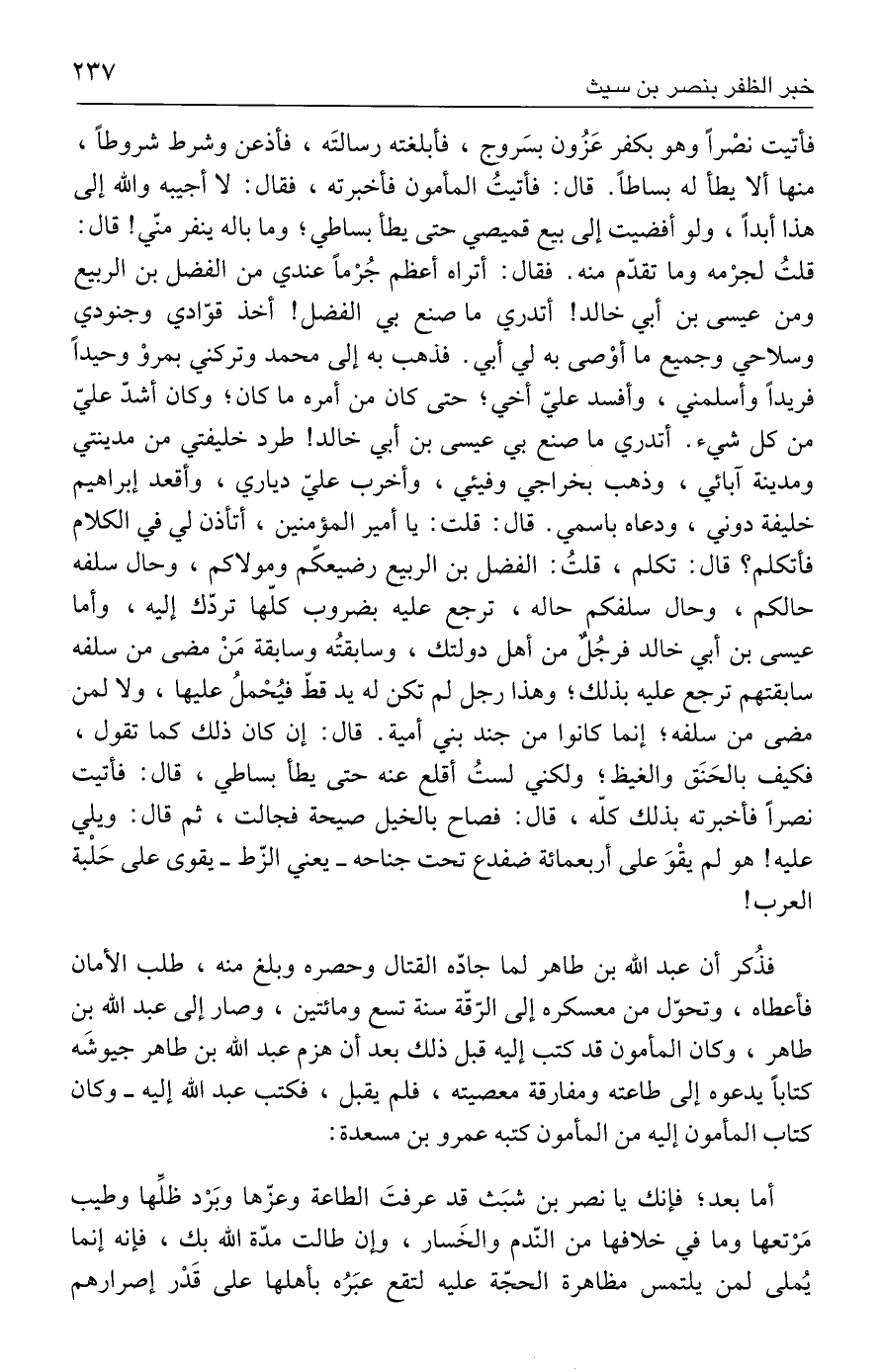 فأتيت نصْرًا وهو بكفر عَزُون بسَروج، فأبلغته رسالتَه، فأذعن وشرط شروطًا، منها ألا يطأ له بساطًا. قال: فأتيتُ المأمون فأخبرته، فقال: لا أجيبه والله إلى هذا أبدًا، ولو أفضيت إلى بيع قميصي حتى يطأ بساطي؛ وما باله ينفر منّي! قال: قلتُ لجرْمه وما تقدّم منه. فقال: أتراه أعظم جُرْمًا عندي من الفضل بن الربيع ومن عيسى بن أبي خالد! أتدري ما صنع بي الفضل! أخذ قوّادي وجنودي وسلاحي وجميع ما أوْصى به لي أبي. فذهب به إلى محمد وتركني بمروْ وحيدًا فريدًا وأسلمني، وأفسد عليّ أخي؛ حتى كان من أمره ما كان؛ وكان أشدّ عليّ من كل شيء. أتدري ما صنع بي عيسى بن أبي خالد! طرد خليفتي من مدينتي ومدينة آبائي، وذهب بخراجي وفيئي، وأخرب عليّ دياري، وأقعد إبراهيم خليفة دوني، ودعاه باسمي. قال: قلت: يا أمير المؤمنين، أتأذن لي في الكلام فأتكلم؟ قال: تكلم، قلتُ: الفضل بن الربيع رضيعكم ومولاكم، وحال سلفه حالكم، وحال سلفكم حاله، ترجع عليه بضروب كلّها تردّك إليه، وأما عيسى بن أبي خالد فرجُلٌ من أهل دولتك، وسابقتُه وسابقة مَنْ مضى من سلفه سابقتهم ترجع عليه بذلك؛ وهذا رجل لم تكن له يد قطّ فيُحْملُ عليها، ولا من مضى من سلفه؛ إنما كانوا من جند بني أمية. قال: إن كان ذلك كما تقول، فكيف بالحَنَق والغيظ؛ ولكني لستُ أقلع عنه حتى يطأ بساطي، قال: فأتيت نصرًا فأخبرته بذلك كلّه، قال: فصاح بالخيل صيحة فجالت، ثم قال: ويلي عليه! هو لم يقْوَ على أربعمائة ضفدع تحت جناحه - يعني الزّط - يقوى على حَلْبة العرب!