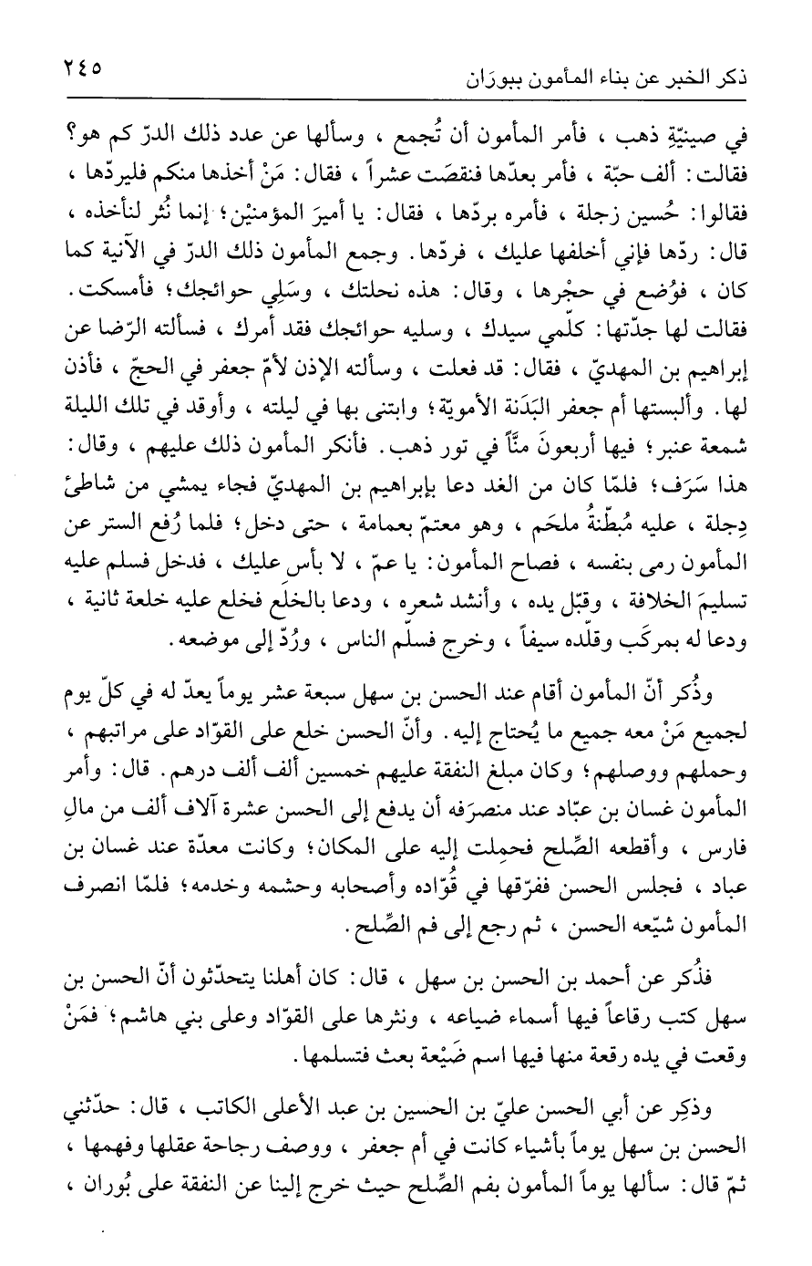 وذكِر عن أبي الحسن عليّ بن الحسين بن عبد الأعلى الكاتب، قال: حدّثني الحسن بن سهل يومًا بأشياء كانت في أم جعفر، ووصف رجاحة عقلها وفهمها، ثمّ قال: سألها يومًا المأمون بفم الصِّلح حيث خرج إلينا عن النفقة على بُوران،
